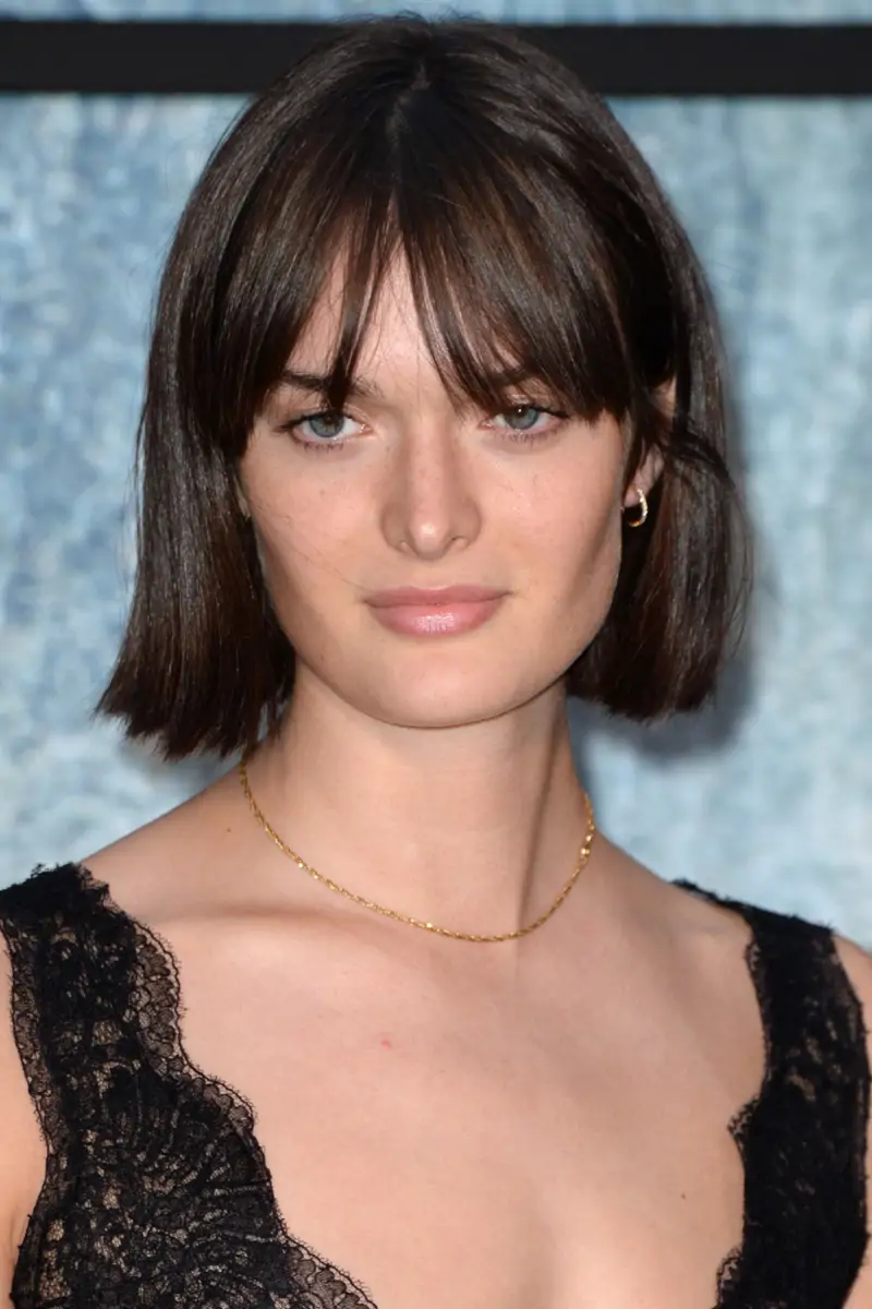 La frange est essentielle à la coupe au carré graphique , mais elle est toujours bien intégrée pour ne pas durcir les traits du visage.