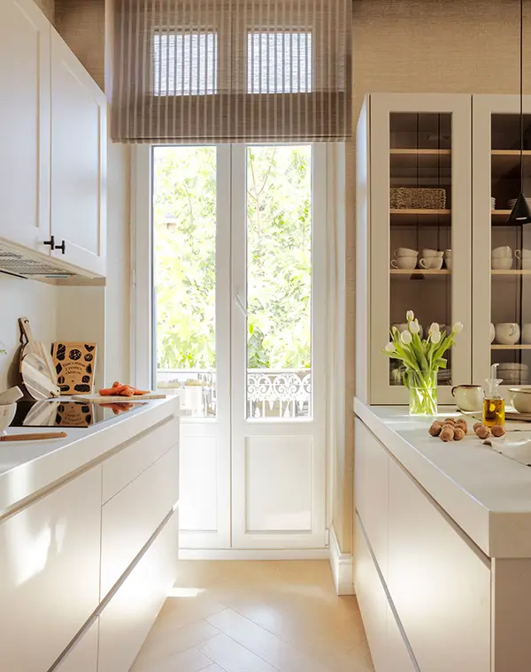 Les vitrines permettent de créer une sensation de légèreté tout en apportant une touche décorative. Elles sont particulièrement utiles dans les petites cuisines où chaque détail compte pour maintenir une impression d’espace.