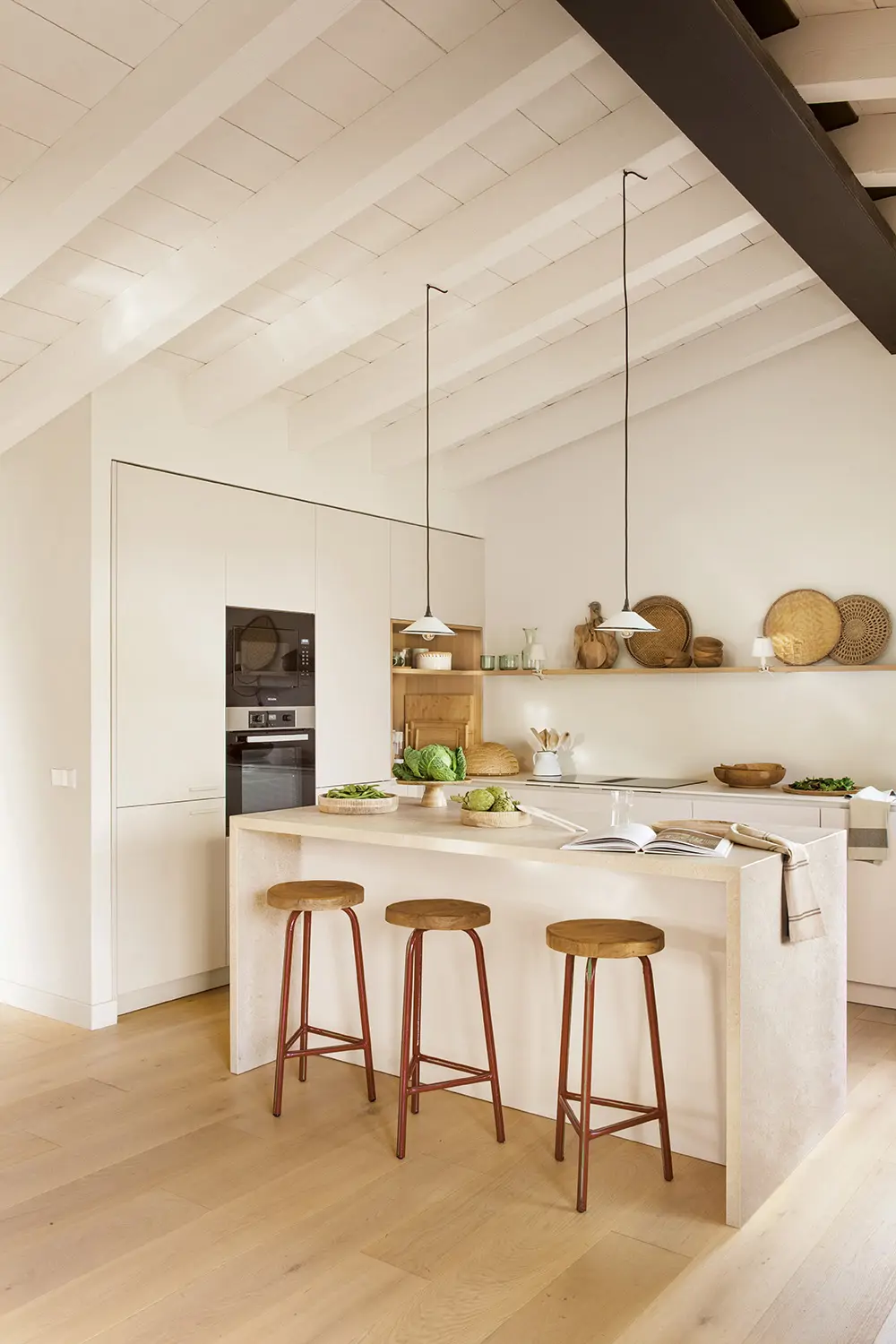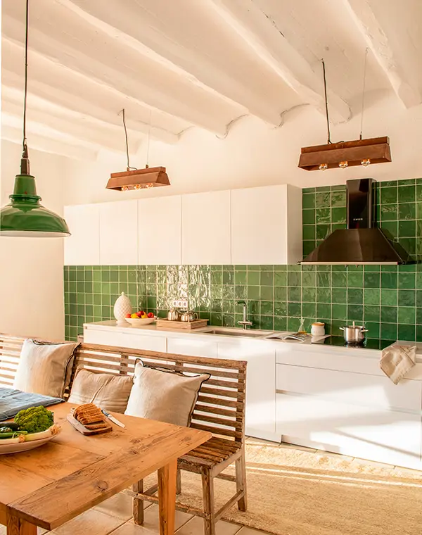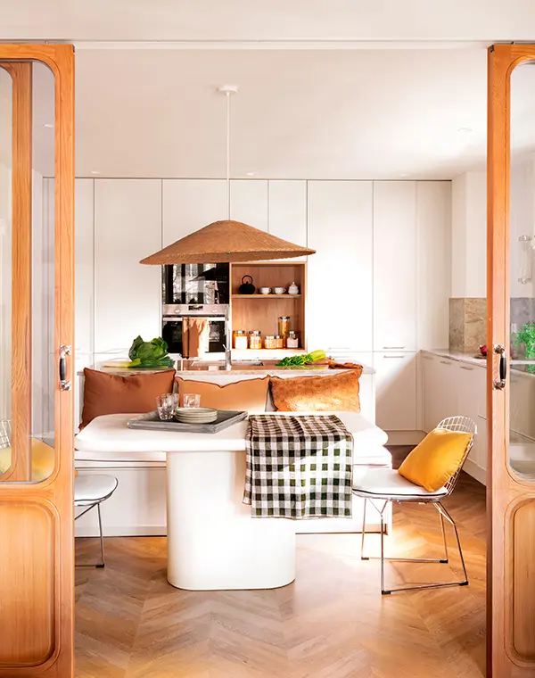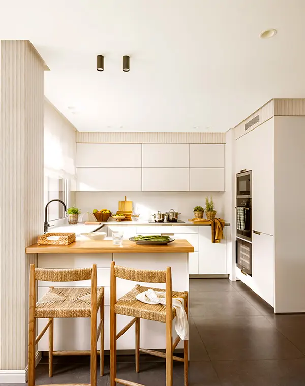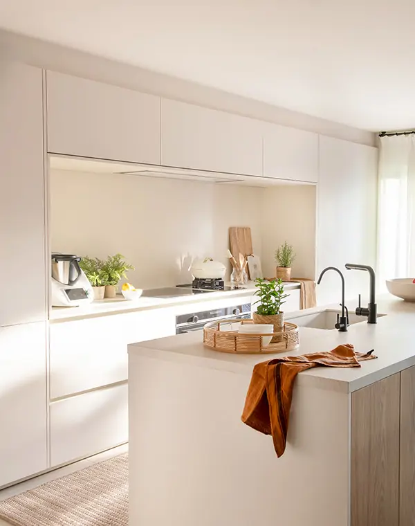 L’une des combinaisons les plus réussies pour une cuisine blanche consiste à l’associer à des éléments en bois clair.