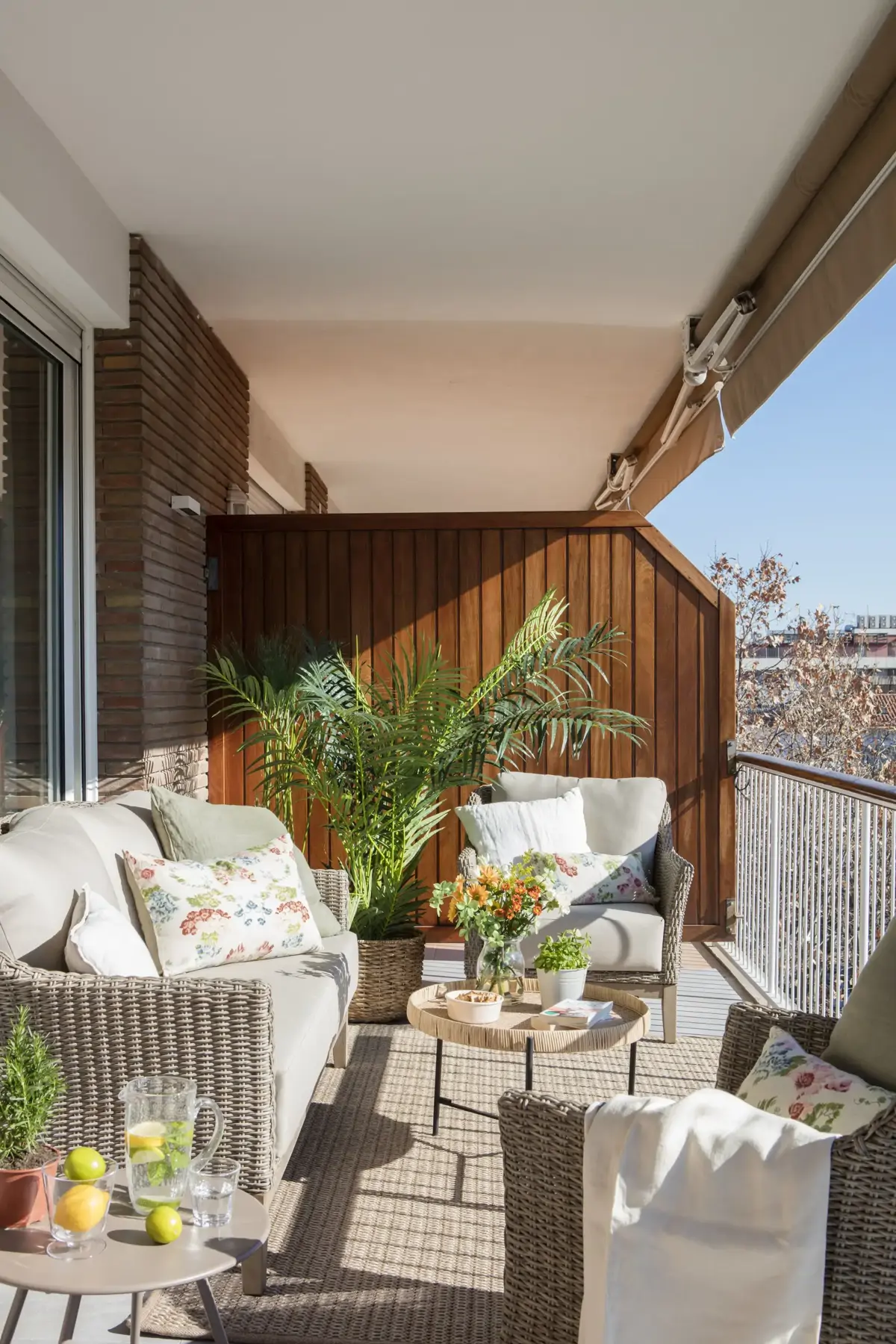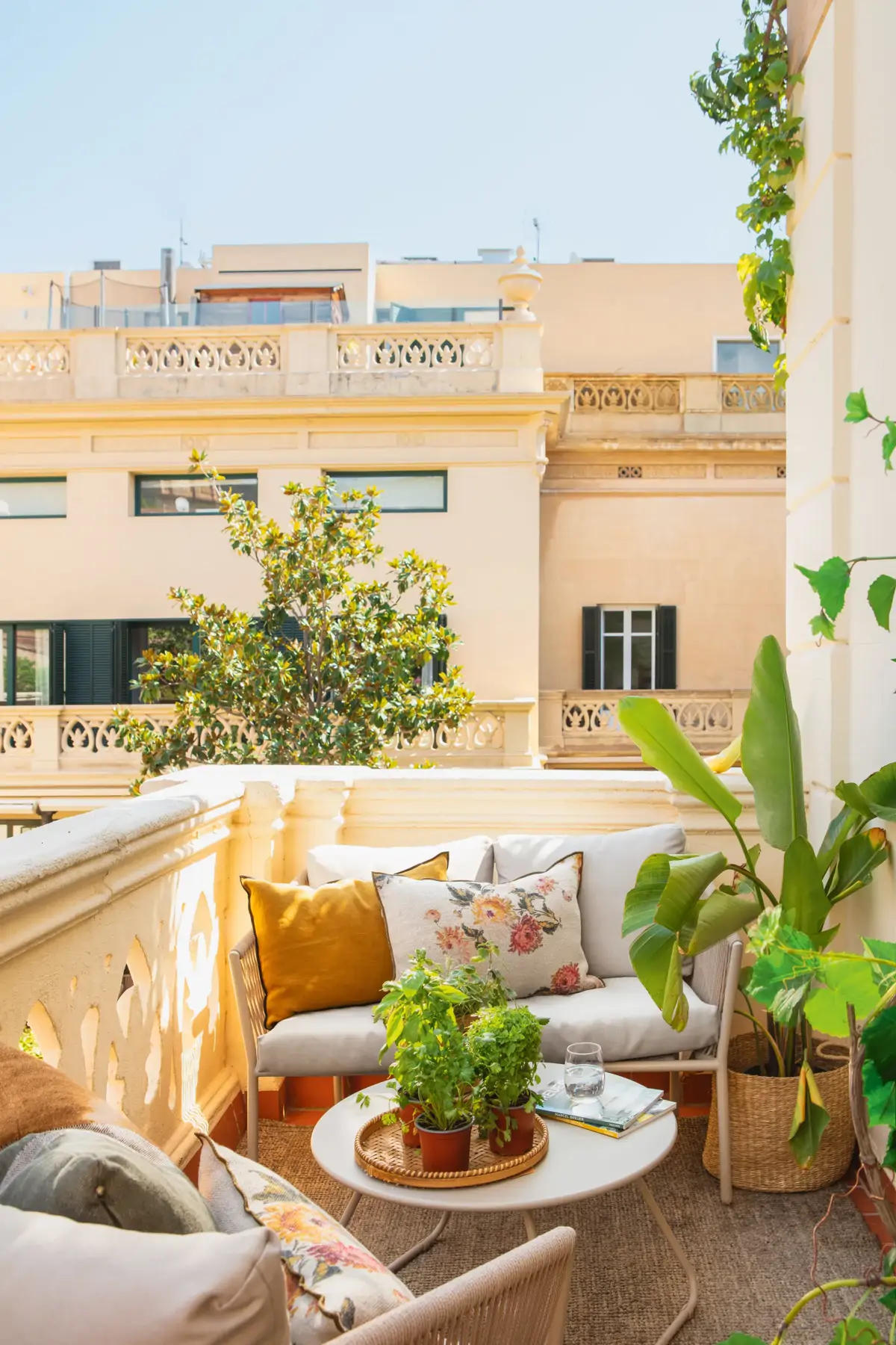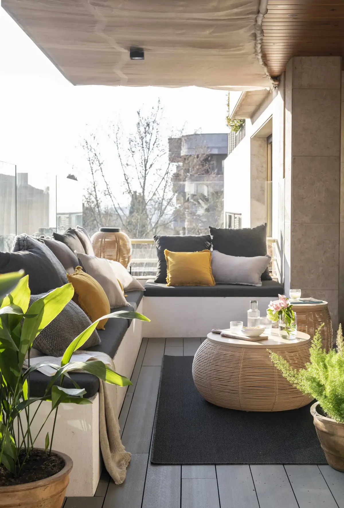 Un aménagement chaleureux et rustique suffit amplement pour votre petit balcon. Jouez avec des matériaux naturels comme la laine, le bois ou les tissus biologiques . Vous pouvez également y ajouter un point d’eau ou un système de chauffage, selon la saison. Nous pouvons aussi ajouter des guirlandes pour profiter de la terrasse tard le soir.