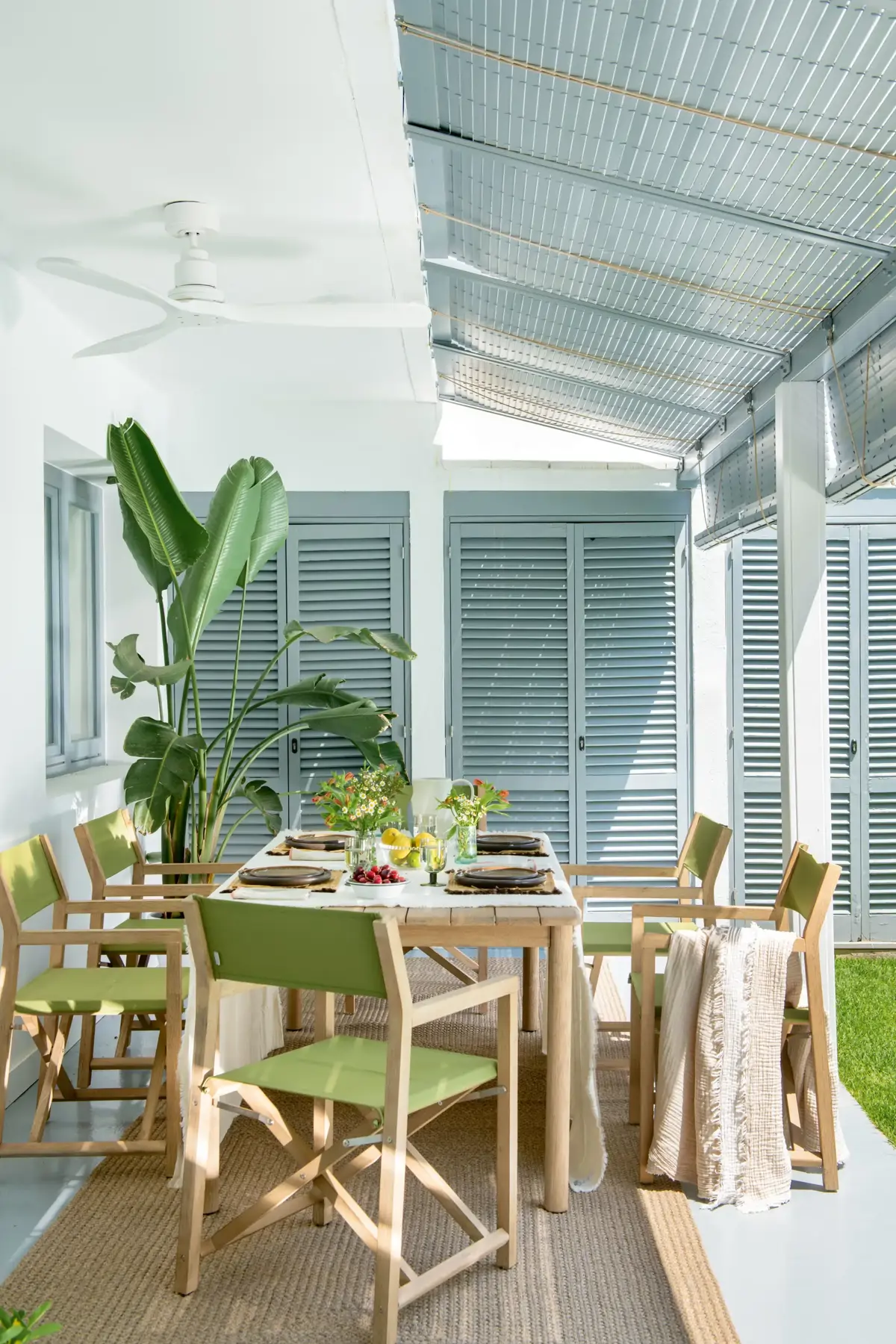 Sur cette longue véranda, la table à manger rectangulaire est assortie à des chaises vertes et mise en valeur par des boiseries bleu pastel . Un magnifique ensemble !
