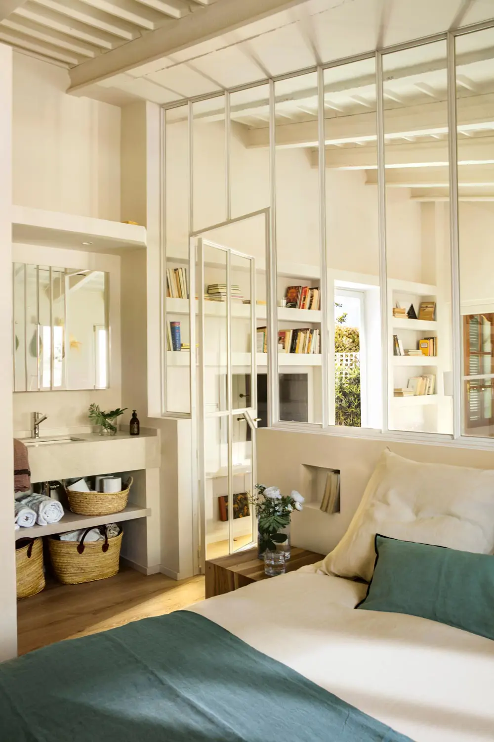 Chaque centimètre compte . Optez pour des solutions sur mesure ; elles seront vos meilleurs alliées pour optimiser votre espace. Une idée : faites réaliser un meuble vasque intégré, plan de travail compris, comme dans cette chambre. Il s’adaptera parfaitement à l’espace disponible. Pensez à le compléter par un muret pour soutenir la paroi de douche, ce qui permettra de gagner encore plus de place.