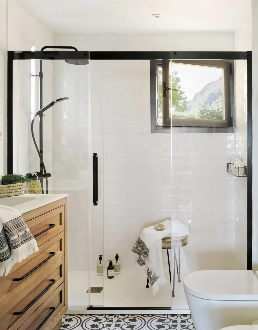 Design invisible . Optez pour une paroi de douche en verre transparent avec un cadre minimal afin de ne rien obstruer la lumière. Idéalement, placez la douche près d’une fenêtre, si vous en avez une, pour créer une impression de profondeur et d’espace.