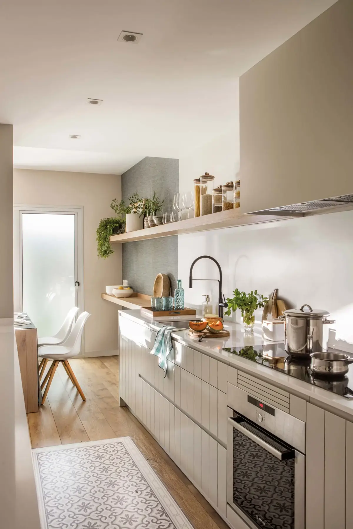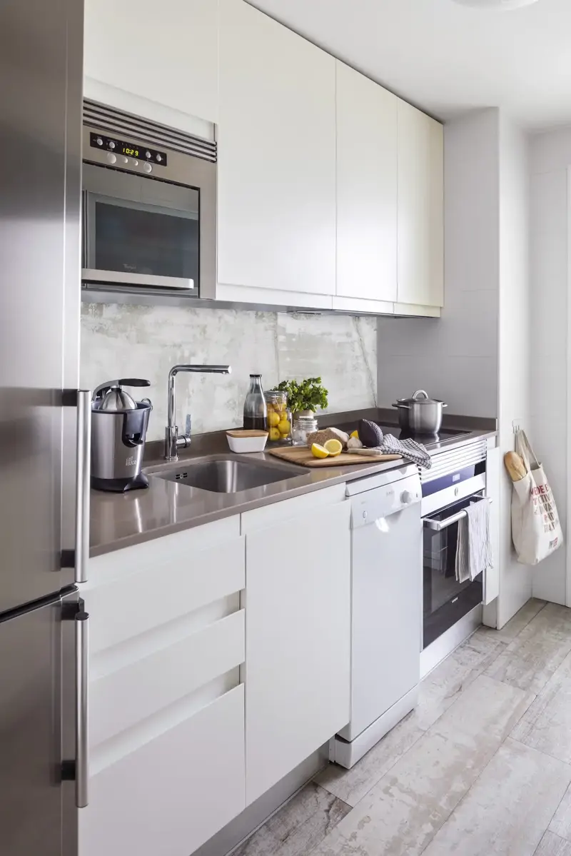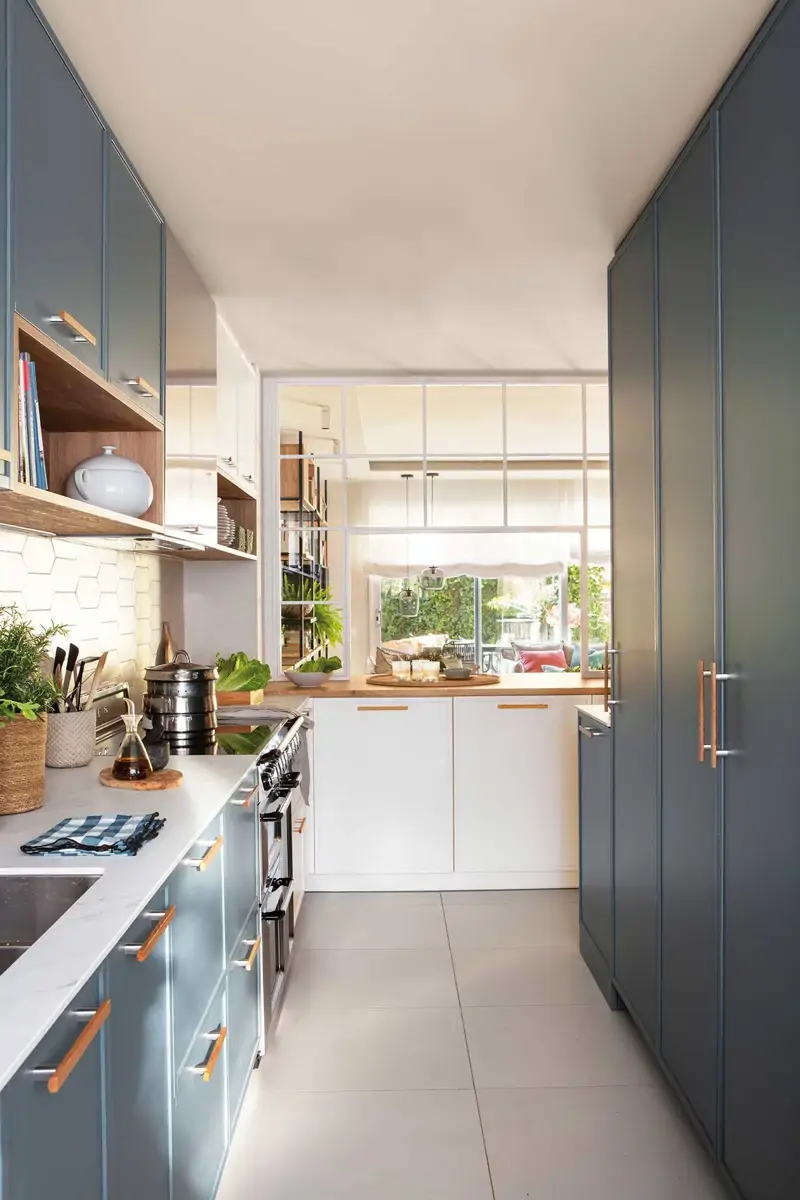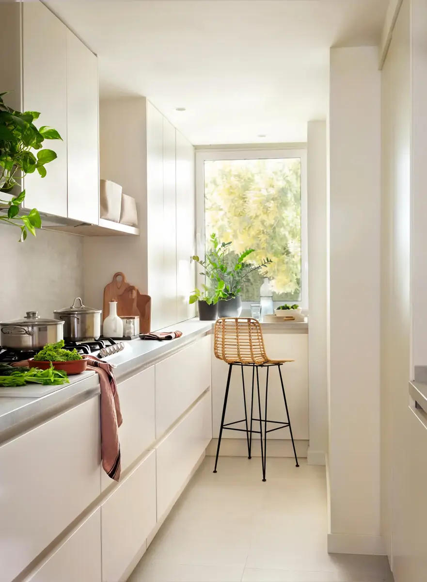 Dans une cuisine étroite, l’effet visuel est presque aussi important que l’agencement lui-même.