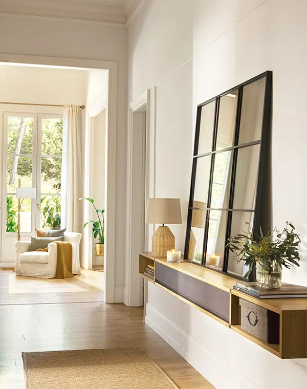 Un grand miroir posé sur un mur latéral peut complètement transformer la perception d’un couloir étroit.