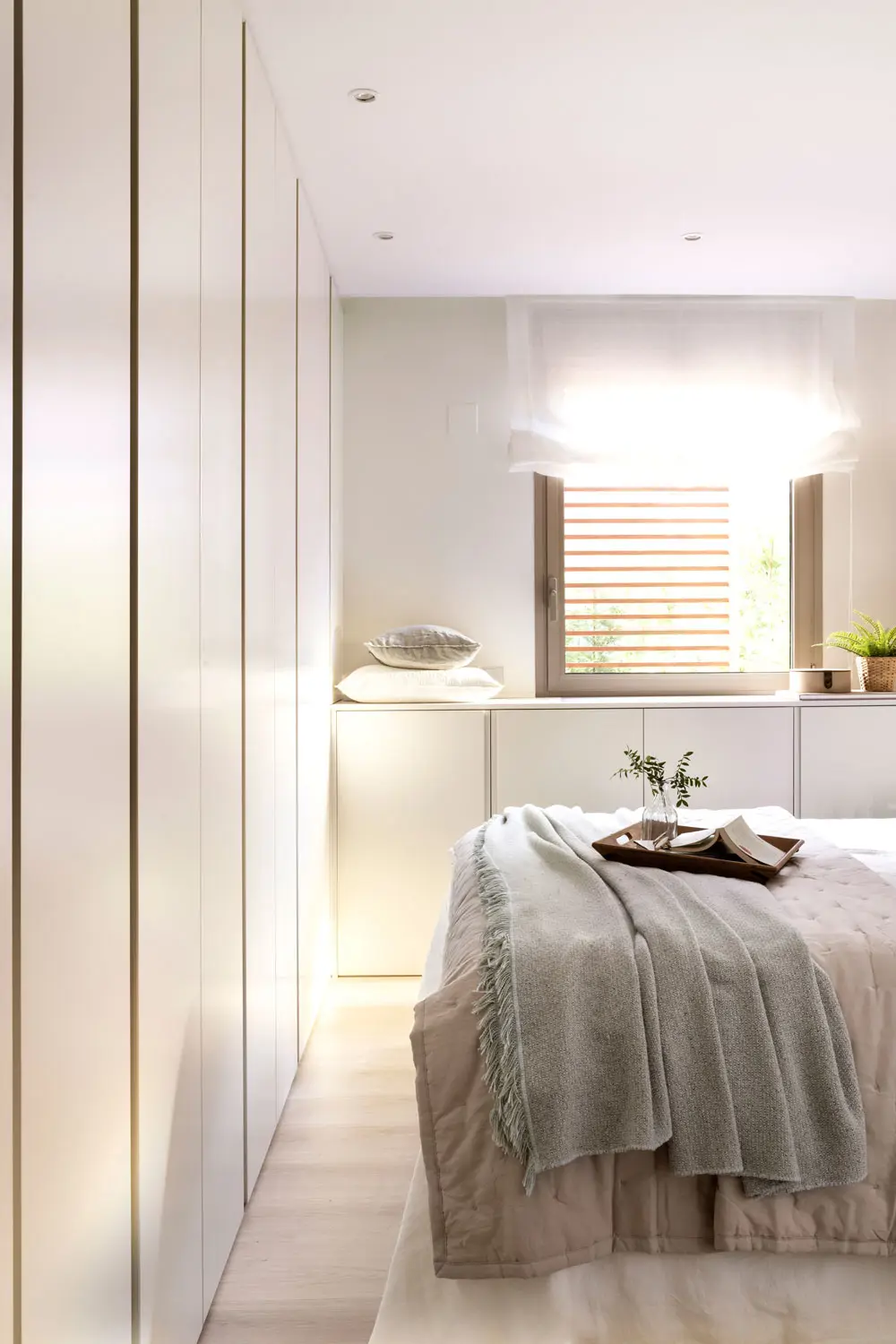 Lorsque l’espace est limité, la verticalité devient un atout précieux . Concevoir des armoires allant jusqu’au plafond est une excellente idée. Juancho nous explique que, dans certains projets, il a intégré le lit à l’intérieur même des armoires, « créant ainsi une sorte de niche . Cela structure l’espace et donne une impression visuelle d’espace plus grand. »