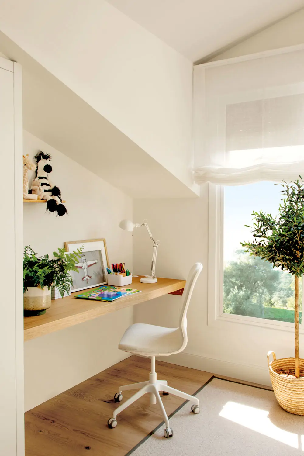 Par exemple, dans cette petite chambre mansardée, l’espace le plus bas a été astucieusement aménagé pour créer un bureau léger composé d’un plateau en bois et d’une chaise à roulettes.