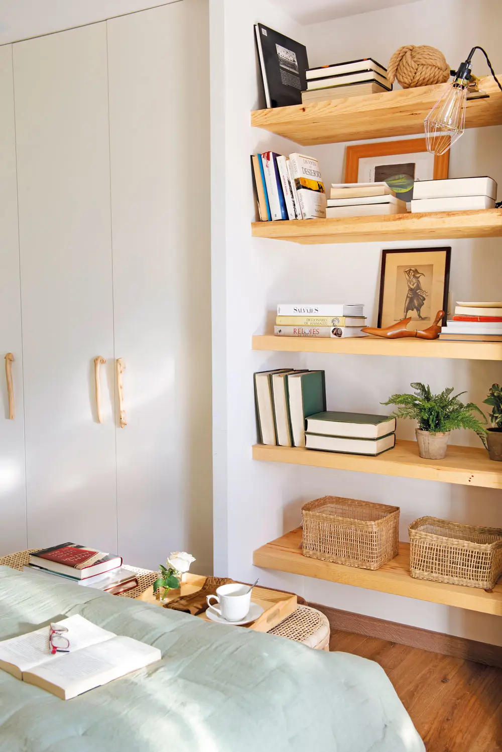 Tables de chevet flottantes, petites étagères, bureaux fixés au mur… En ne touchant pas le sol, ils créent une plus grande impression de légèreté visuelle et permettent une circulation plus fluide. Un élément fondamental dans une petite chambre. Il ne faut pas non plus encombrer en dessous.