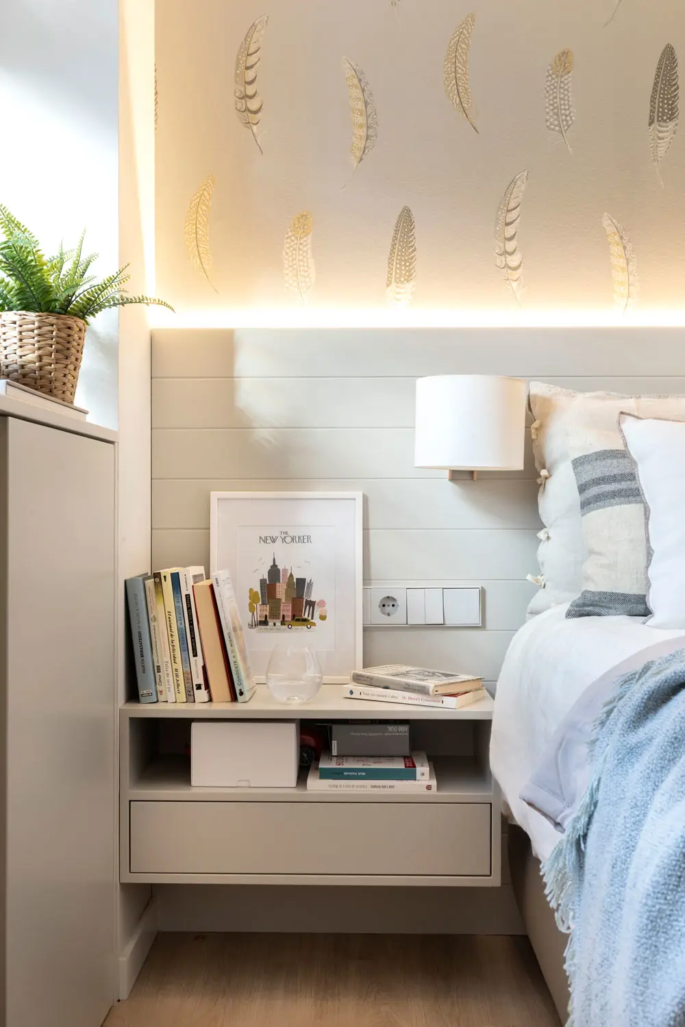 Dans ce projet, Pia a placé une bande LED dissimulée derrière la tête de lit , ce qui crée une ambiance chaleureuse, rend l’espace plus accueillant et ne prend absolument pas de place !