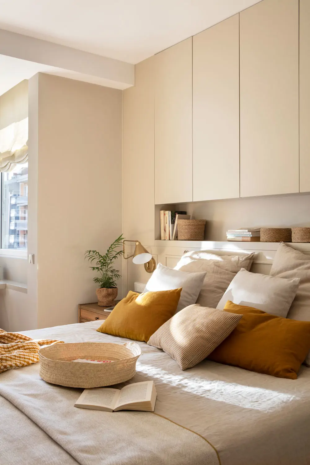 Des armoires simples qui montent jusqu’au plafond pour gagner du rangement dans la chambre
