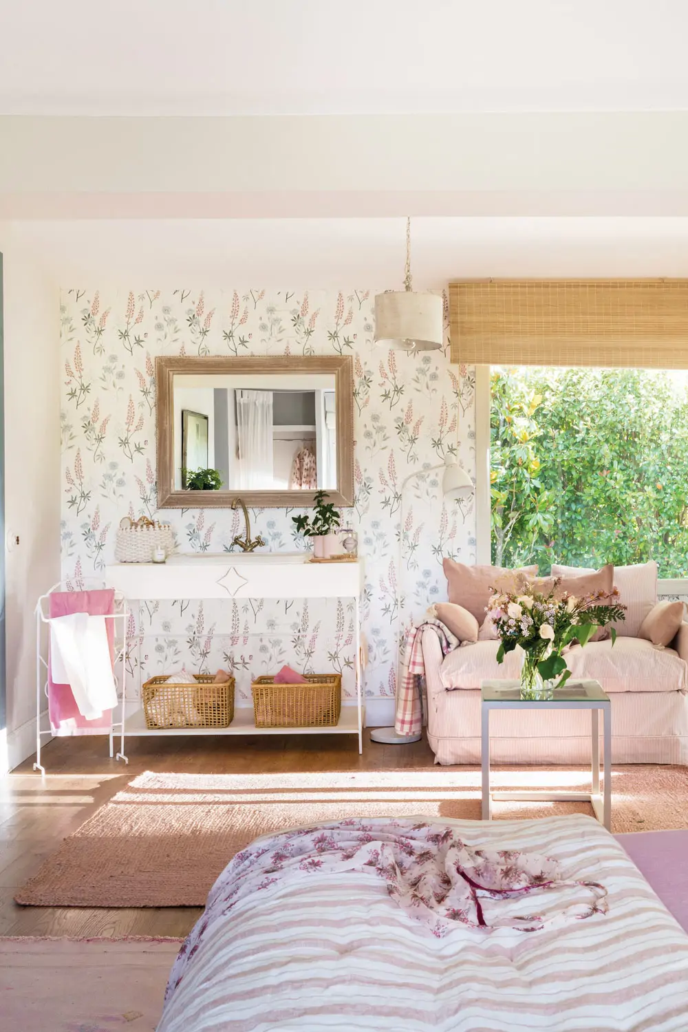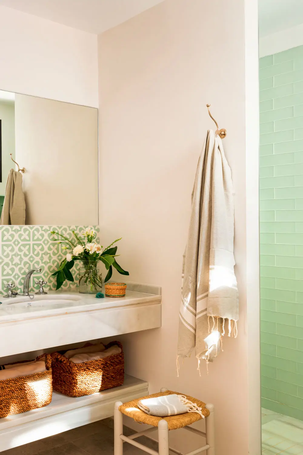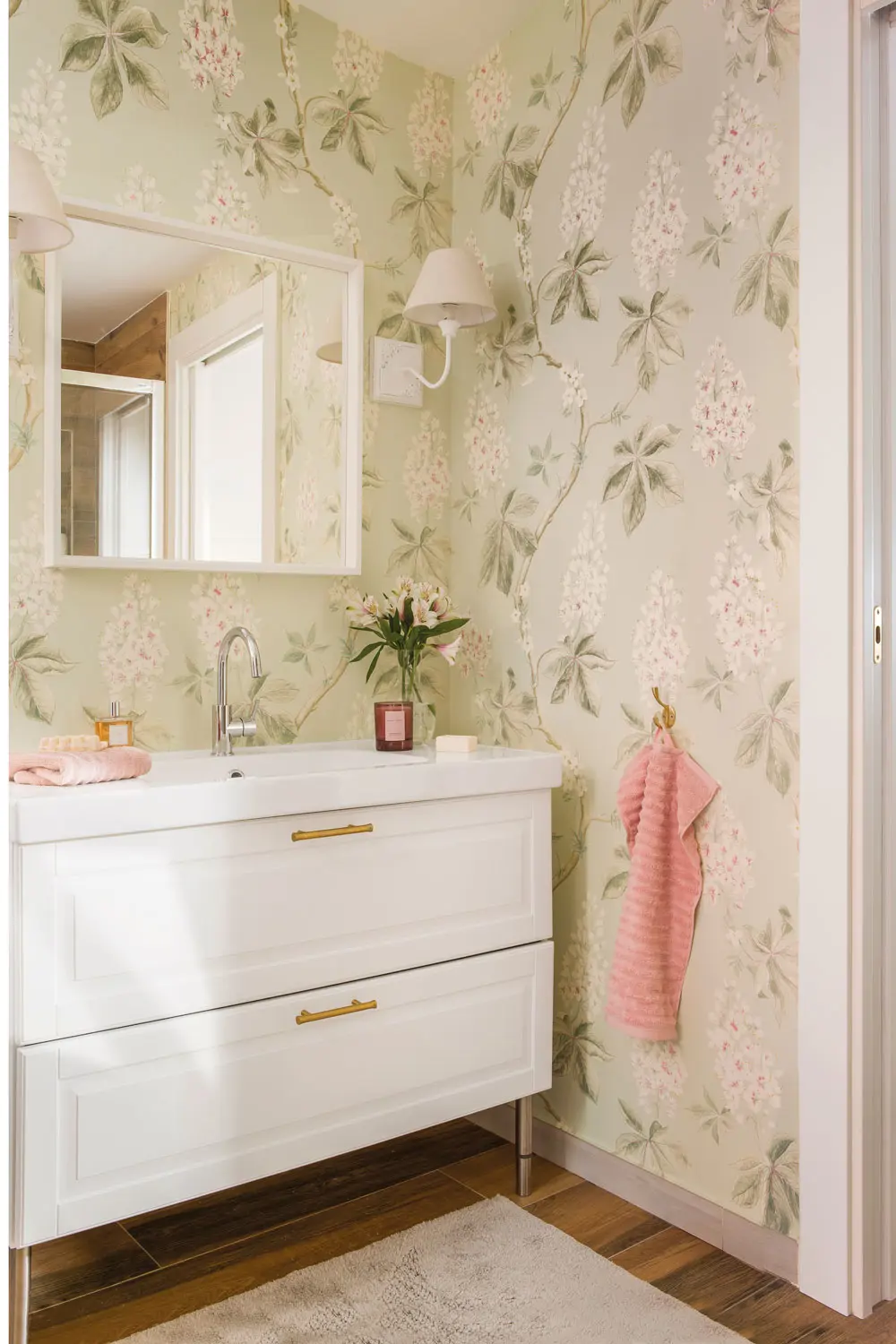 La décoratrice d’intérieur Laura Crespo l’a bien compris et a opté pour un motif botanique sur fond vert clair de la marque Sanderson au niveau du lavabo, créant ainsi une ambiance fraîche et très féminine.