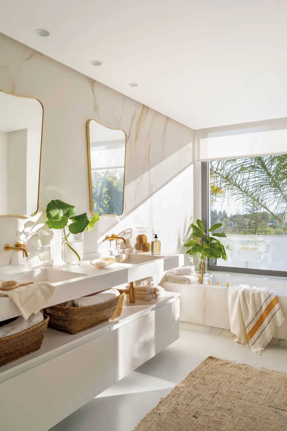 Une base blanche immaculée rehaussée de touches dorées, d’éléments en fibres naturelles et de plantes crée une ambiance ravissante dans cette salle de bains, idéale pour profiter du printemps. La baignoire, placée sous la fenêtre, offre une vue imprenable.