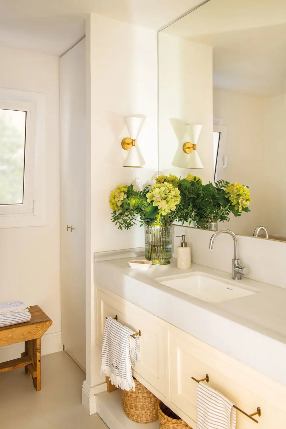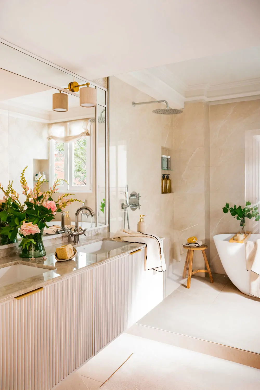Ces idées sont mises en valeur dans ces 15 salles de bains sélectionnées , certaines attenantes à la salle de bains principale, d’autres non, mais toutes absolument magnifiques. Une façon infaillible d’ intégrer des fleurs fraîches de saison — roses, hortensias, mimosas — dans des tons doux de bleu, lilas ou rose, ajoutera non seulement un délicieux parfum, mais agira également comme un désodorisant naturel.