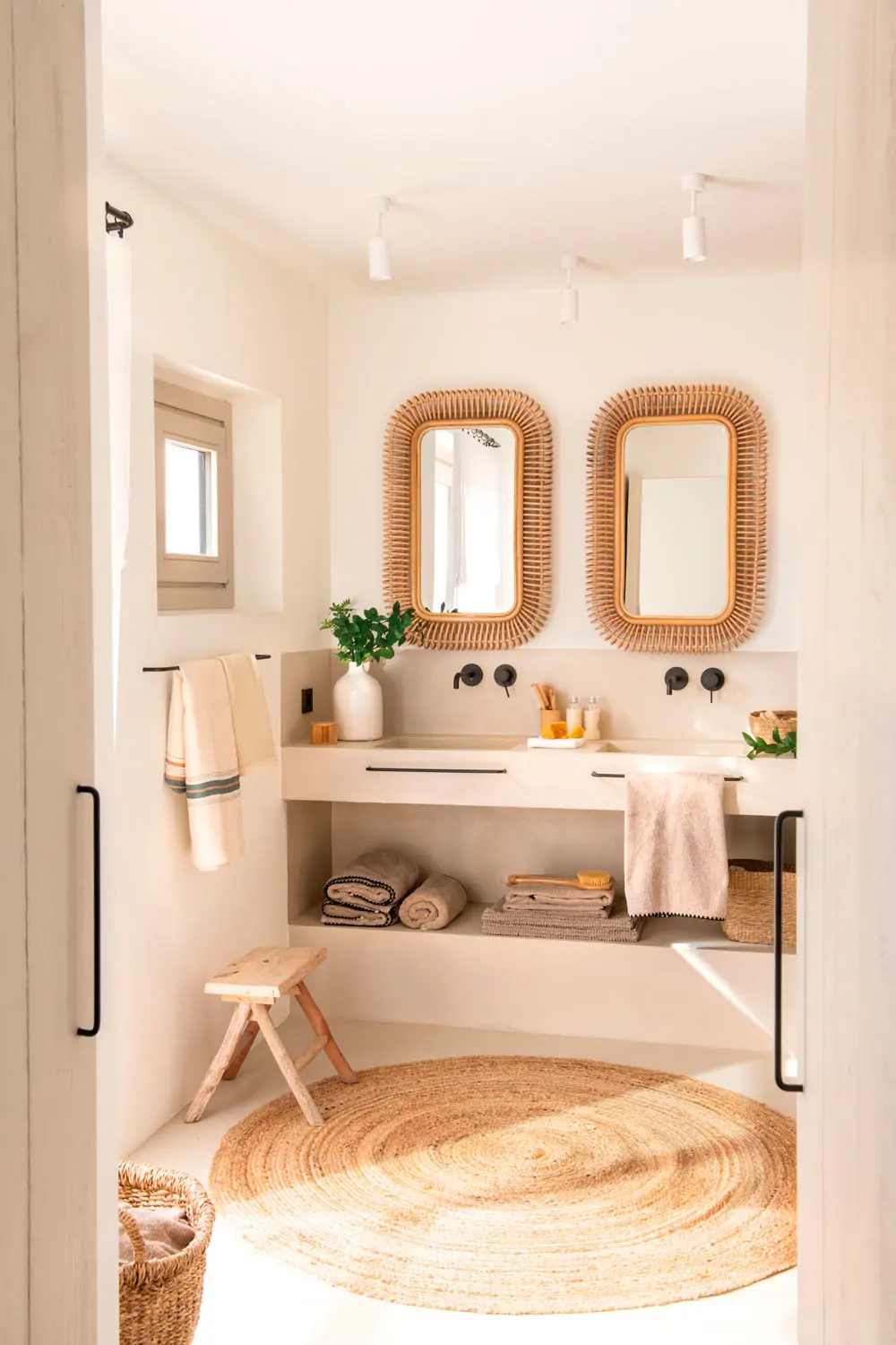 Les miroirs encadrés de rotin de La Redoute, associés aux porte-serviettes et poignées noirs, apportent une touche naturelle et artisanale à l’espace.
