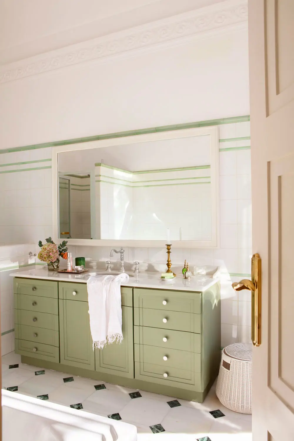 Les moulures et le sol à damier confèrent à cette salle de bains un style classique. Pour adoucir l’ensemble, le meuble-lavabo a été laqué en vert menthe, ce qui lui apporte une touche de fraîcheur et de modernité.