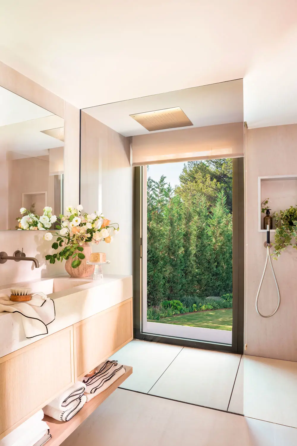 Disposer d’une salle de bains avec accès direct au jardin est un privilège, car cela permet de profiter de la vue depuis l’intérieur, estompant ainsi la frontière entre intérieur et extérieur.