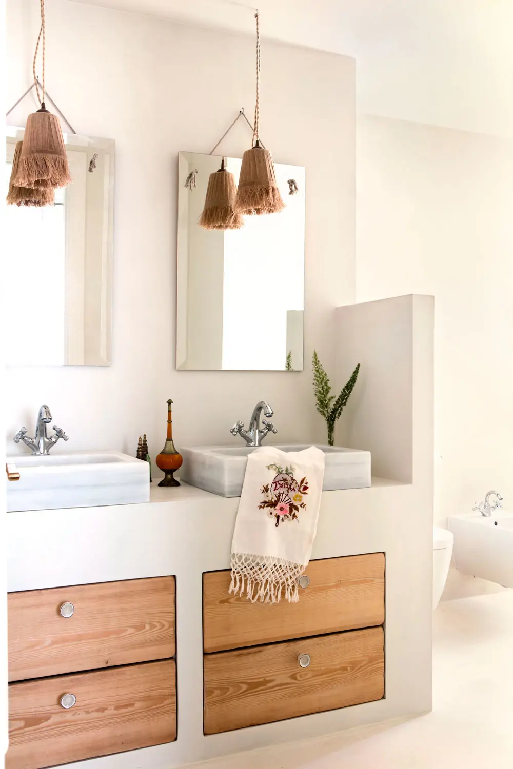 L’architecte Sylvia Preslar a conçu un meuble vasque épuré et minimaliste avec des tiroirs en bois pour cette salle de bains lumineuse aux allures printanières. Sa structure est réalisée en plaques de plâtre recouvertes de microciment , un matériau résistant à l’humidité qui peut également servir de revêtement mural, pour une intégration harmonieuse.