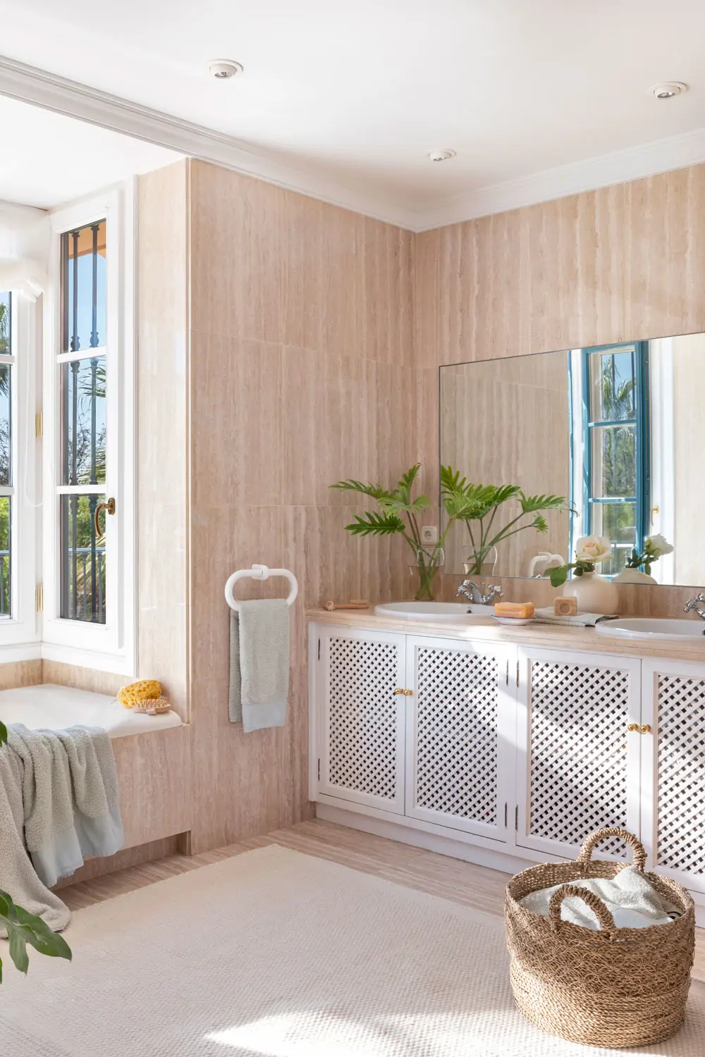 Le minimalisme est à l’honneur dans les salles de bain printanières. Cet exemple parfait illustre bien la présence de murs texturés et d’un meuble vasque en maille qui allège l’espace. Un grand miroir, des paniers en osier, des plantes et des fleurs complètent l’ensemble.