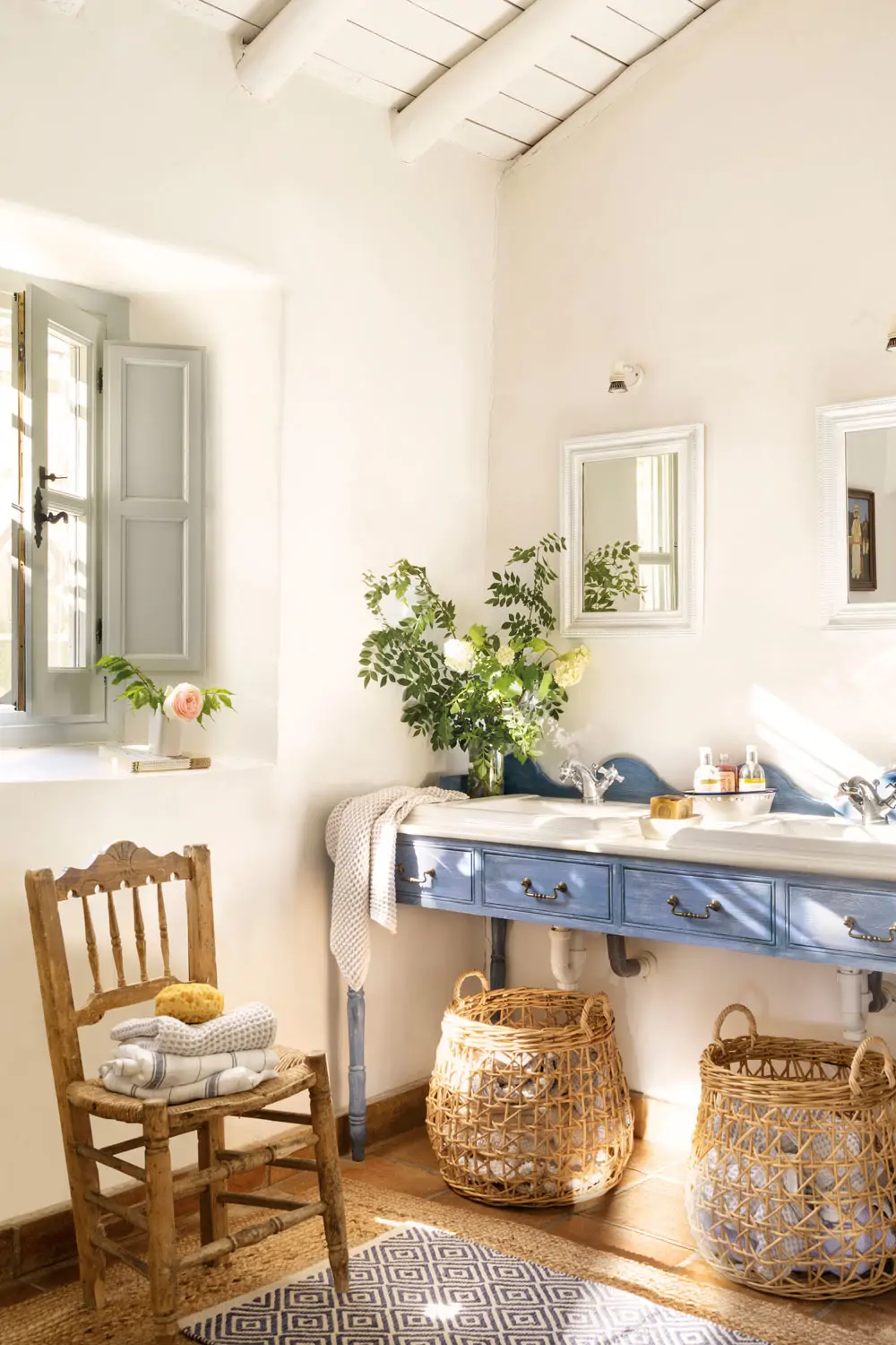 Cette salle de bains évoque le printemps grâce aux différentes couches de peinture utilisées : blanc sur les murs et les poutres restaurées, gris clair sur les encadrements de fenêtres et de volets , et bleu indigo sur le meuble-lavabo ancien.
