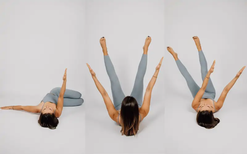 Allongée sur le dos, levez bras et jambes vers le plafond. Réalisez de petits cercles en sens opposés avec vos membres. Cet exercice sollicite les abdominaux et améliore la coordination et la stabilité.