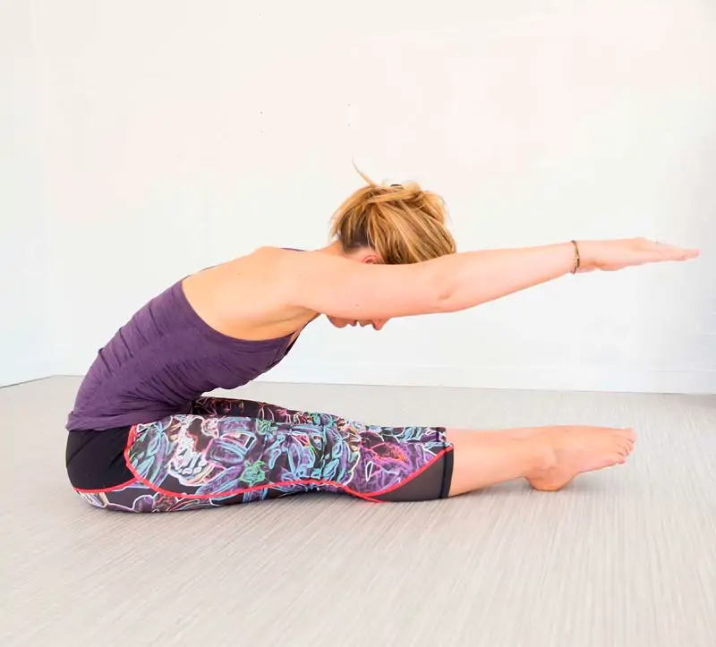 Assise, jambes tendues, penchez doucement le buste vers l’avant en étirant la colonne vertébrale. Ce mouvement soulage les tensions du dos.