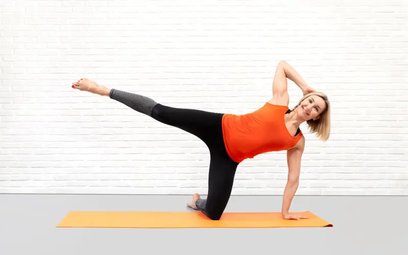 En appui sur un avant-bras, genoux au sol, tendez une jambe sur le côté. Effectuez des mouvements vers l’avant et l’arrière. Ce mouvement tonifie les fessiers et stabilise les hanches.