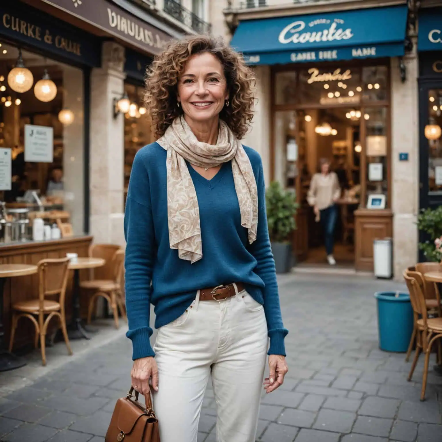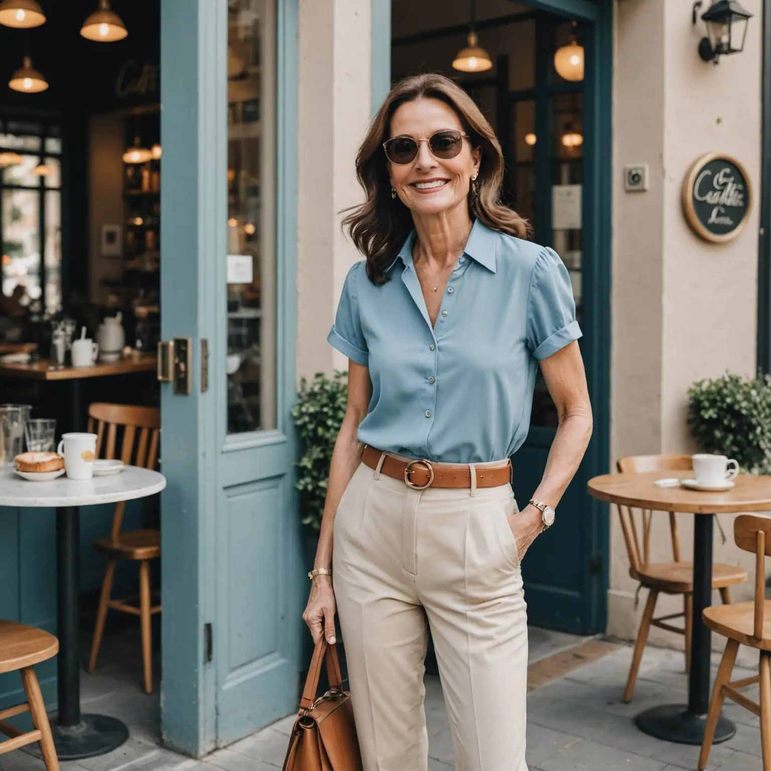 Ce look est la preuve qu’il suffit de peu pour être élégante. Un chemisier à col dans un bleu doux illumine immédiatement le visage, tandis qu’un pantalon large couleur crème allonge la silhouette sans la contraindre. La taille marquée structure l’ensemble sans rigidité.