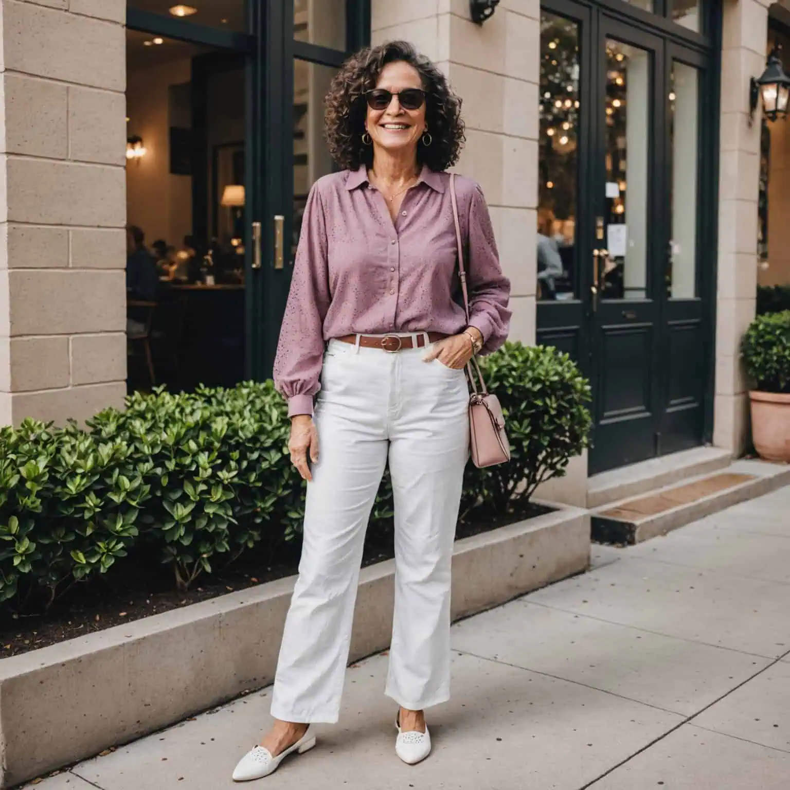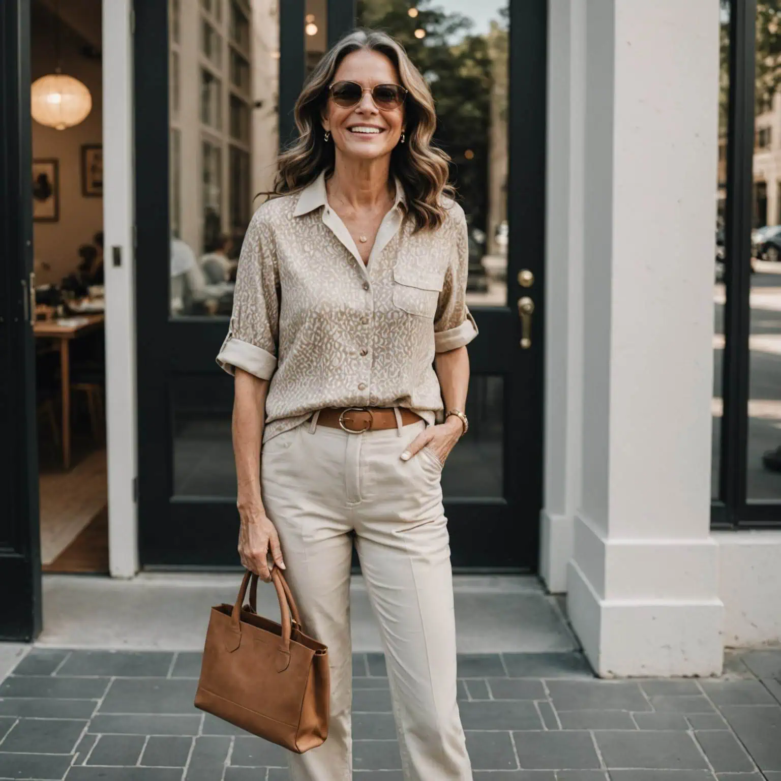 Un chemisier léger associé à un pantalon bien coupé crée une tenue élégante et facile à vivre. Les couleurs claires apportent de la luminosité, tandis que les coupes restent confortables.