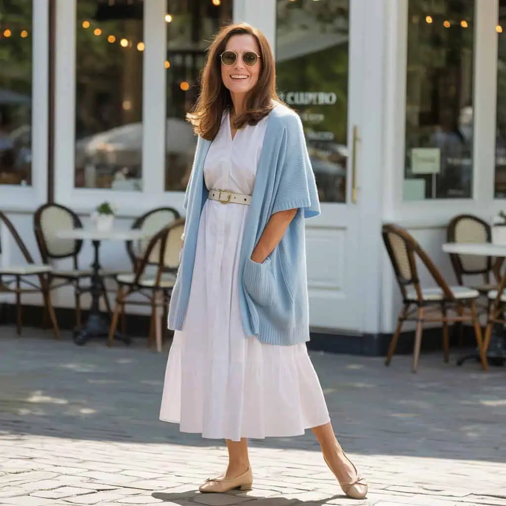 Lorsque les soirées deviennent plus fraîches, le cardigan léger est votre meilleur allié. Porté sur une robe fluide, il apporte immédiatement une sensation de confort sans alourdir la silhouette. Les teintes douces comme le bleu ciel ou le beige créent une allure apaisante et très estivale.