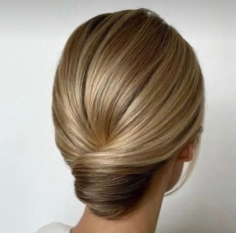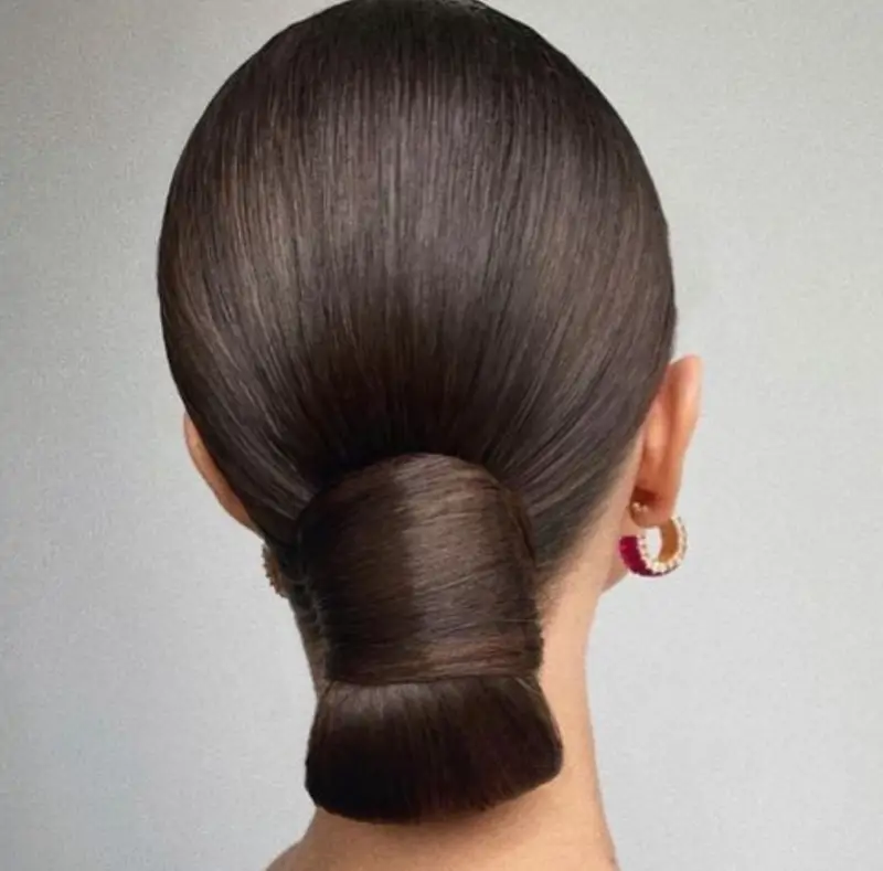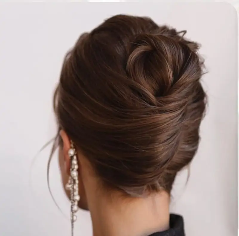 C’est un chignon sophistiqué et élégant, idéal pour les cheveux longs et raides. Il se réalise en rassemblant les cheveux précisément à la nuque, créant ainsi un effet noué chic et raffiné .