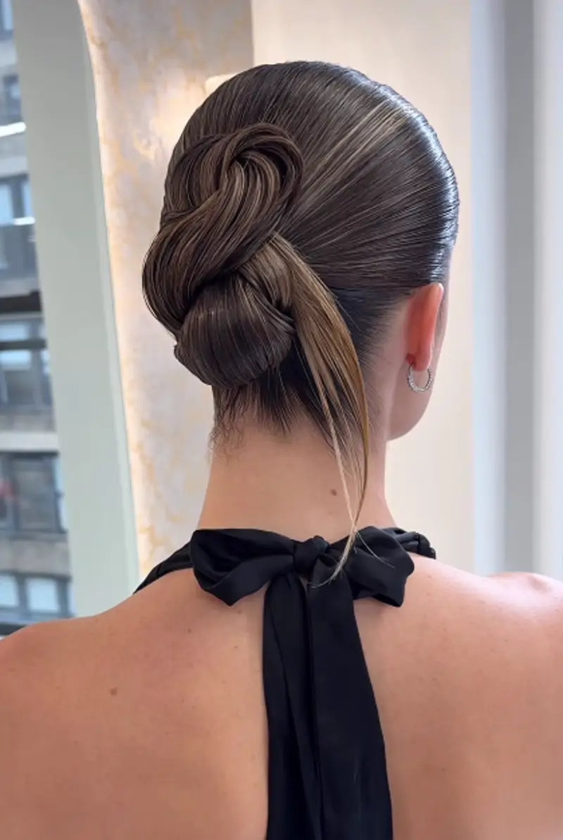 Pour celles qui recherchent une coiffure originale et créative, essayez de jouer avec les formes sculpturales dans des coiffures effet mouillé comme ce chignon. Elles sont idéales pour mettre en valeur des accessoires de tête ou pour opter pour un style plus minimaliste.