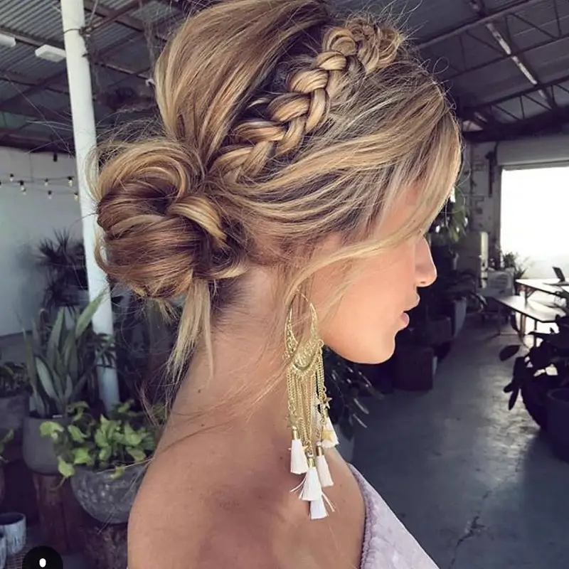 Voici une autre option pour créer une coiffure de style bohème : une petite tresse qui entoure le chignon avec une finition semi-décoiffée.