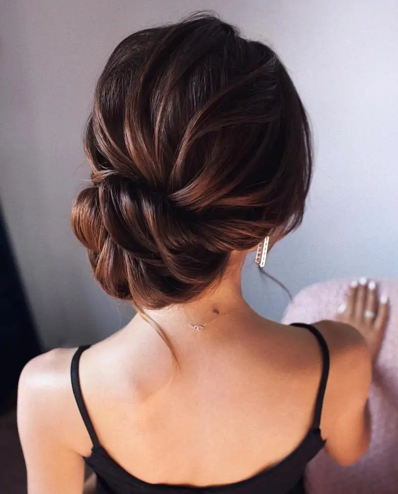 C’est une coiffure classique qui fait toujours son effet auprès des invités, quelle que soit l’occasion. On la réalise en rassemblant les cheveux à l’arrière et en laissant les mèches latérales libres, puis en les torsadant et en les croisant sur le chignon .