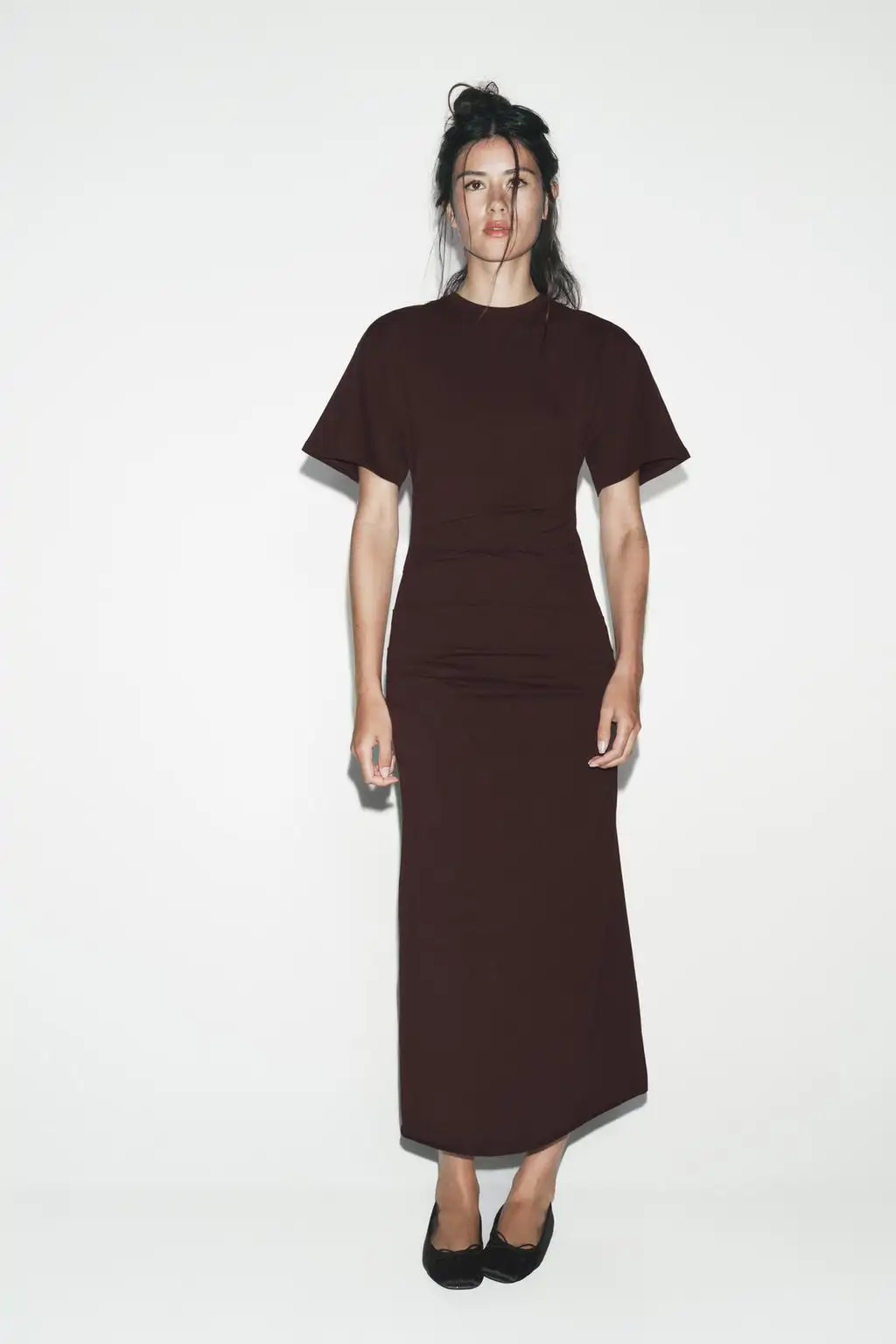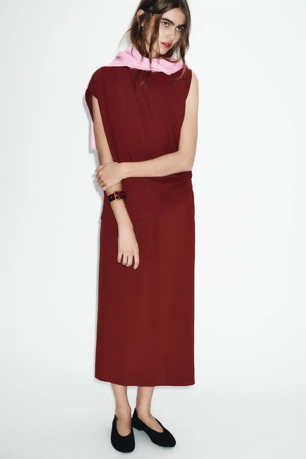 Avec son col montant élégant, son drapé structurant et sa silhouette raffinée, cette robe Zara crée une allure chic et intemporelle.