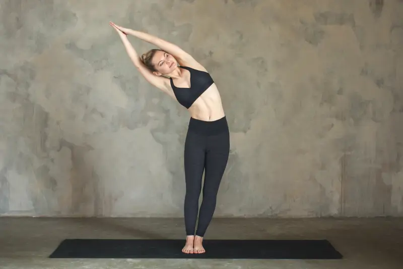Debout, pieds et jambes joints, levez les bras au-dessus de la tête et saisissez votre poignet droit avec votre main gauche. Ensuite, abaissez votre torse vers la gauche et poussez vos hanches dans la direction opposée, en formant un croissant de lune.