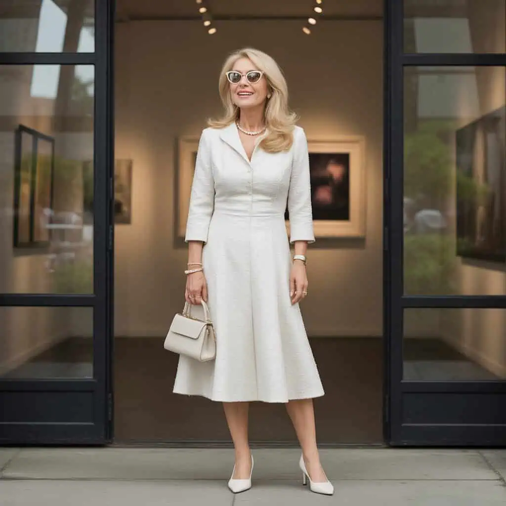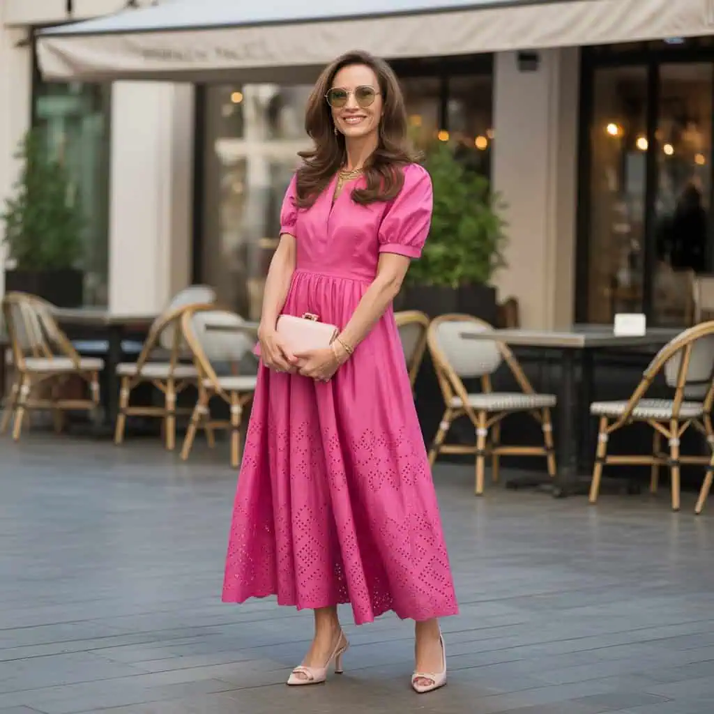 Avec des escarpins à petits talons, des bijoux délicats et un sac crème structuré, cette robe devient une tenue parfaite pour un déjeuner élégant, une sortie culturelle ou un moment entre amies.