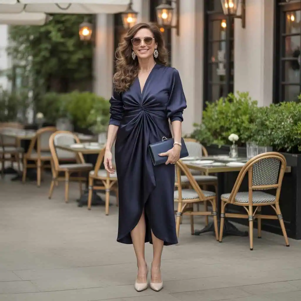4. La robe satinée bleu marine : la sophistication sans effort