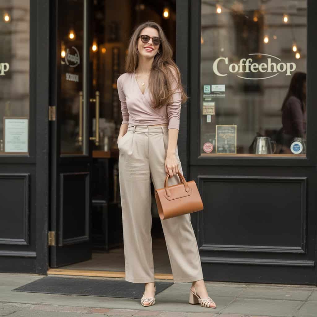Un pantalon beige à jambes larges allonge la silhouette, tandis qu’un top cache-cœur rose poudré ajoute une note sophistiquée.