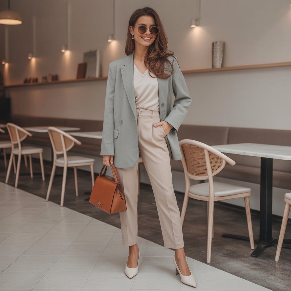 Un blazer gris clair cintré porté sur un haut ivoire à col V affine la silhouette et apporte une touche élégante.