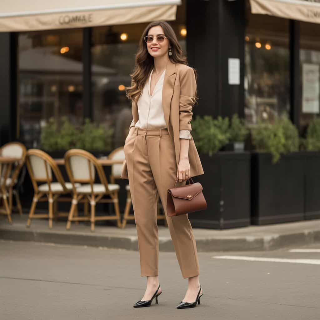 Une chemise ivoire associée à un blazer camel cintré apporte du relief et structure la silhouette. Ce contraste de textures renforce l’aspect chic de la tenue tout en restant facile à porter.