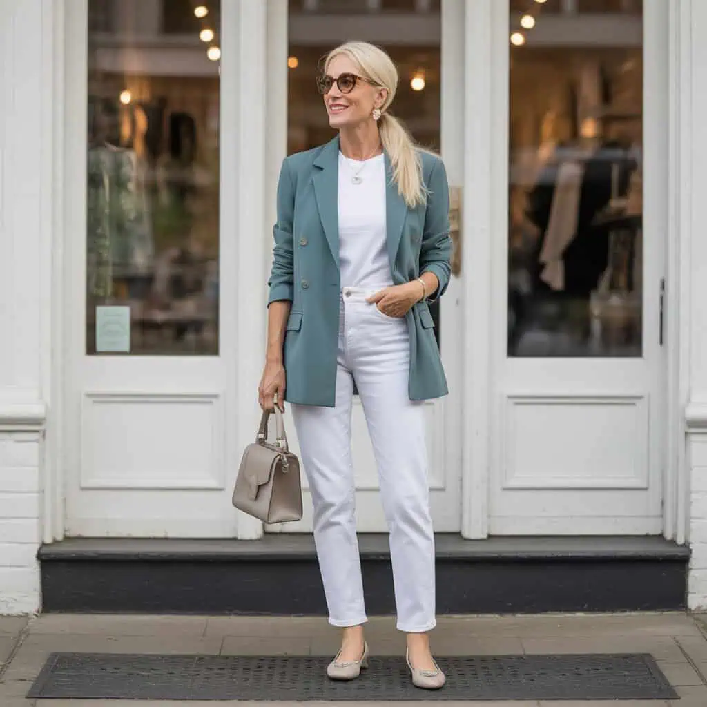 3. Le blazer coloré sur jean blanc : modernité instantanée