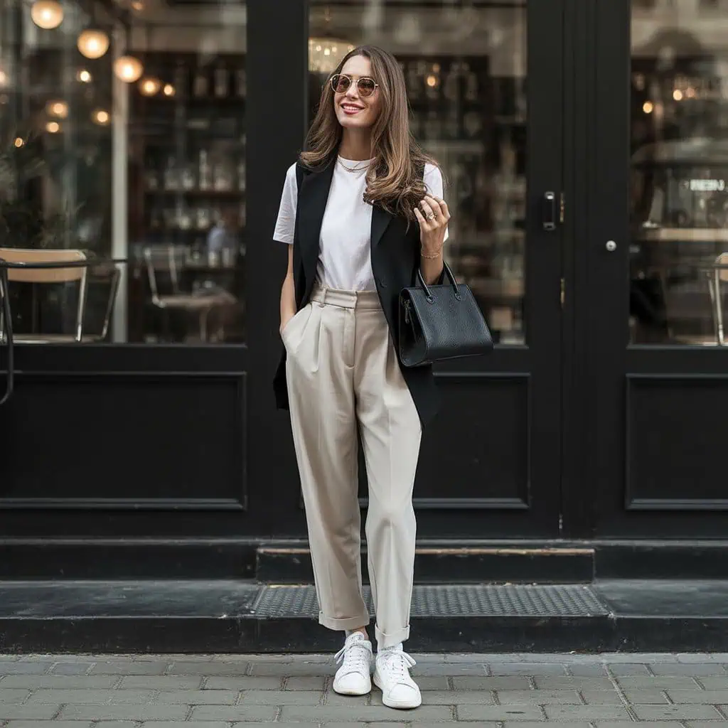 Le gilet structure la silhouette et contraste joliment avec la douceur du tissu du t-shirt, tandis qu’un pantalon beige taille haute rehausse l’ensemble.
