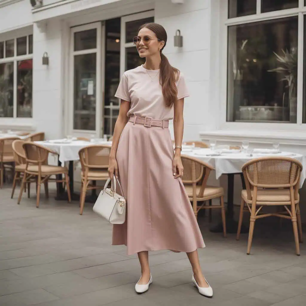 Pour une touche féminine et décontractée, rentrez votre t-shirt blanc dans une jupe midi fluide. Cette association allie confort et élégance : le t-shirt offre une coupe décontractée tandis que la jupe midi apporte un joli mouvement.