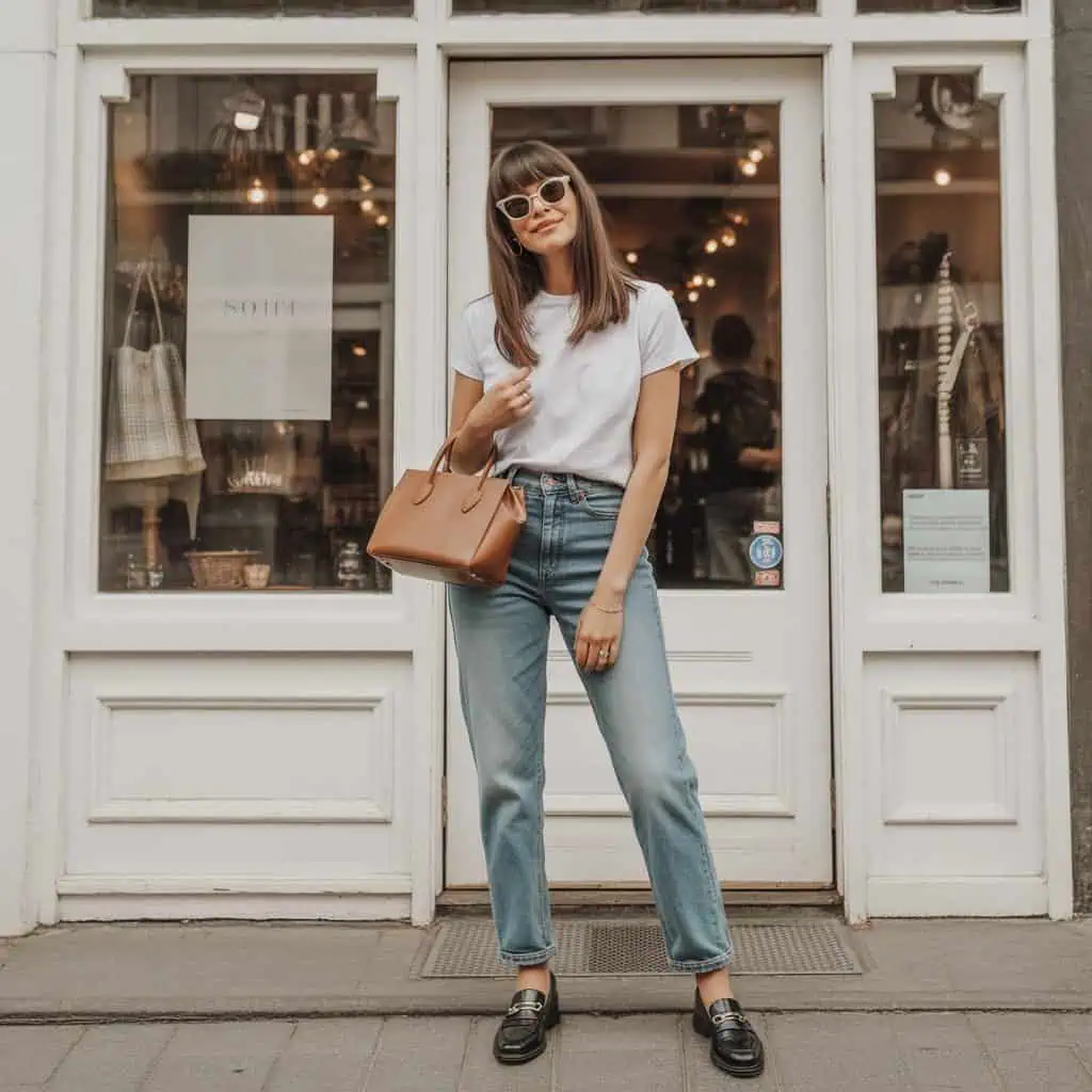 La structure des mocassins apporte une touche de sophistication, transformant le combo jean-t-shirt intemporel en une tenue résolument tendance.