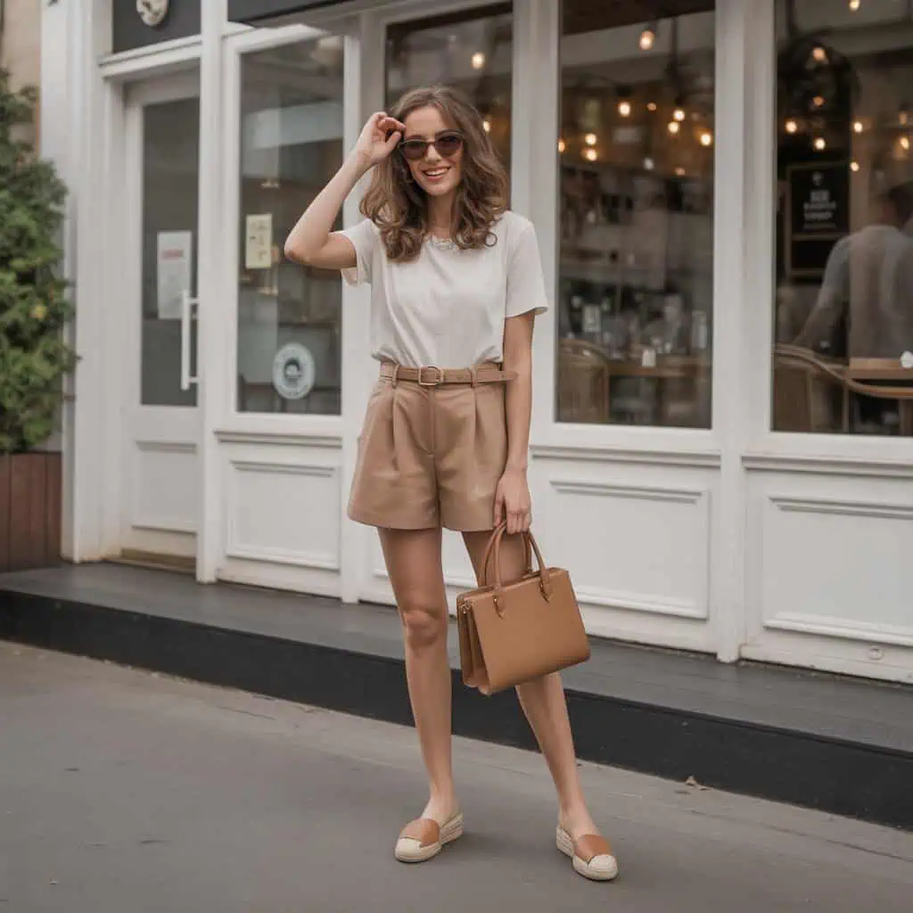 Les espadrilles apportent une élégance décontractée qui équilibre le côté structuré du short, tandis que les lunettes de soleil oversize ajoutent une touche de glamour estival sans effort.
