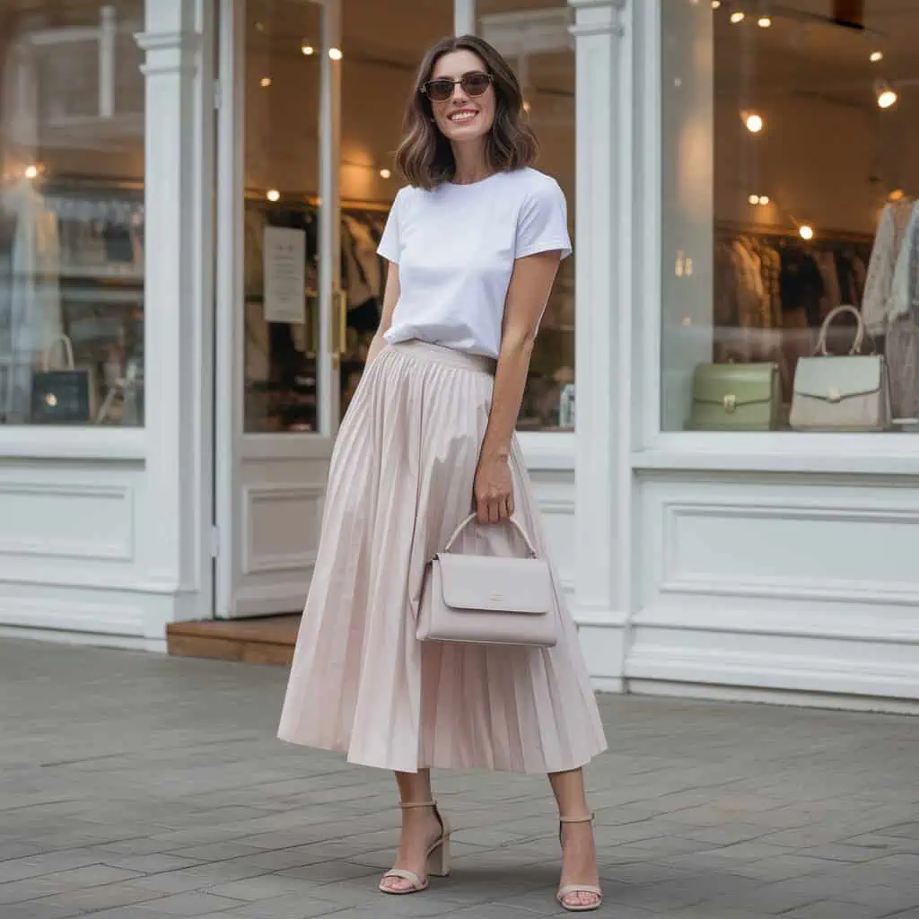 Des sandales à talons allongent la silhouette et apportent une touche raffinée, tandis qu’un sac à main structuré harmonise l’ensemble.