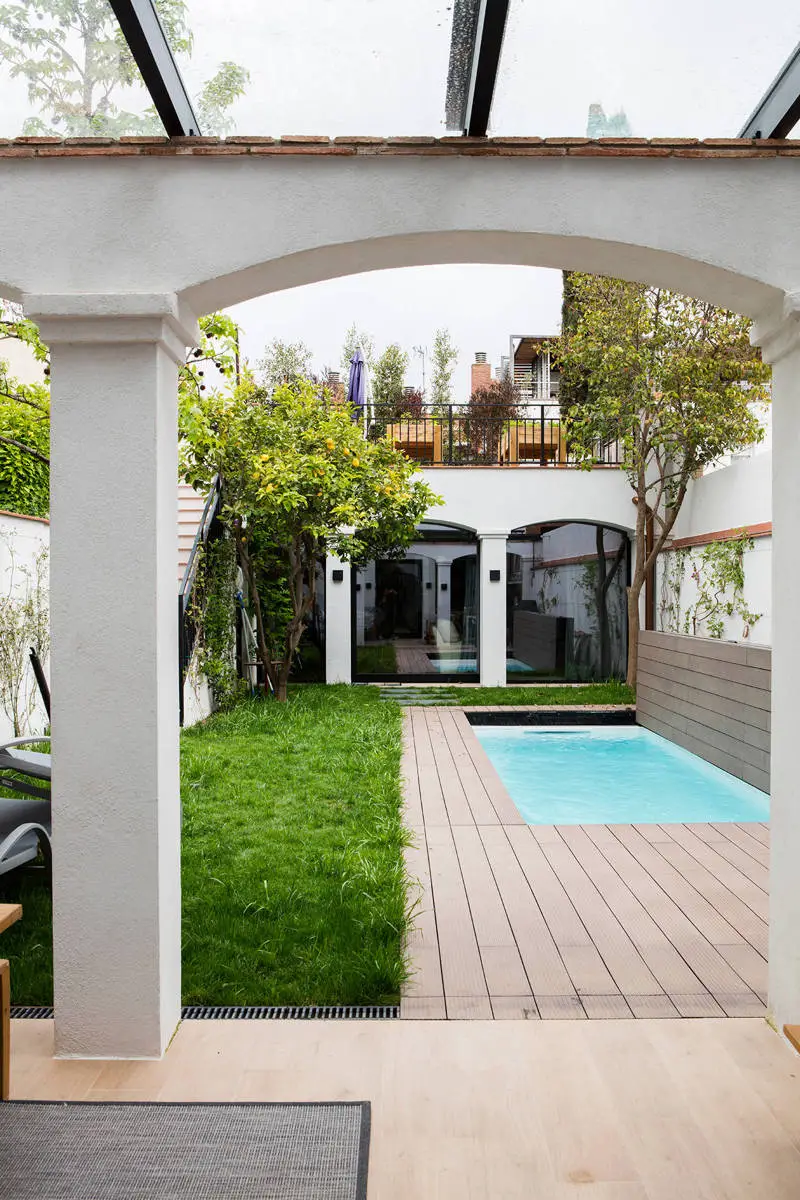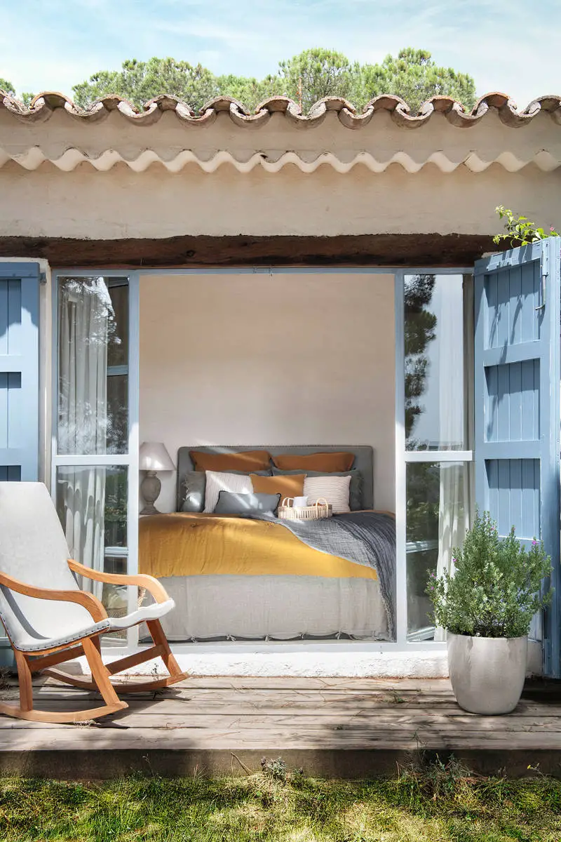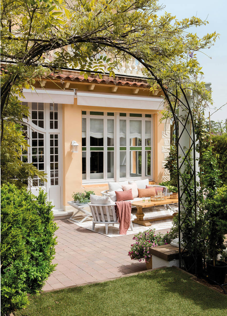 Si votre jardin n’est pas pavé, une petite plateforme en bois peut servir de transition entre la maison et l’extérieur.