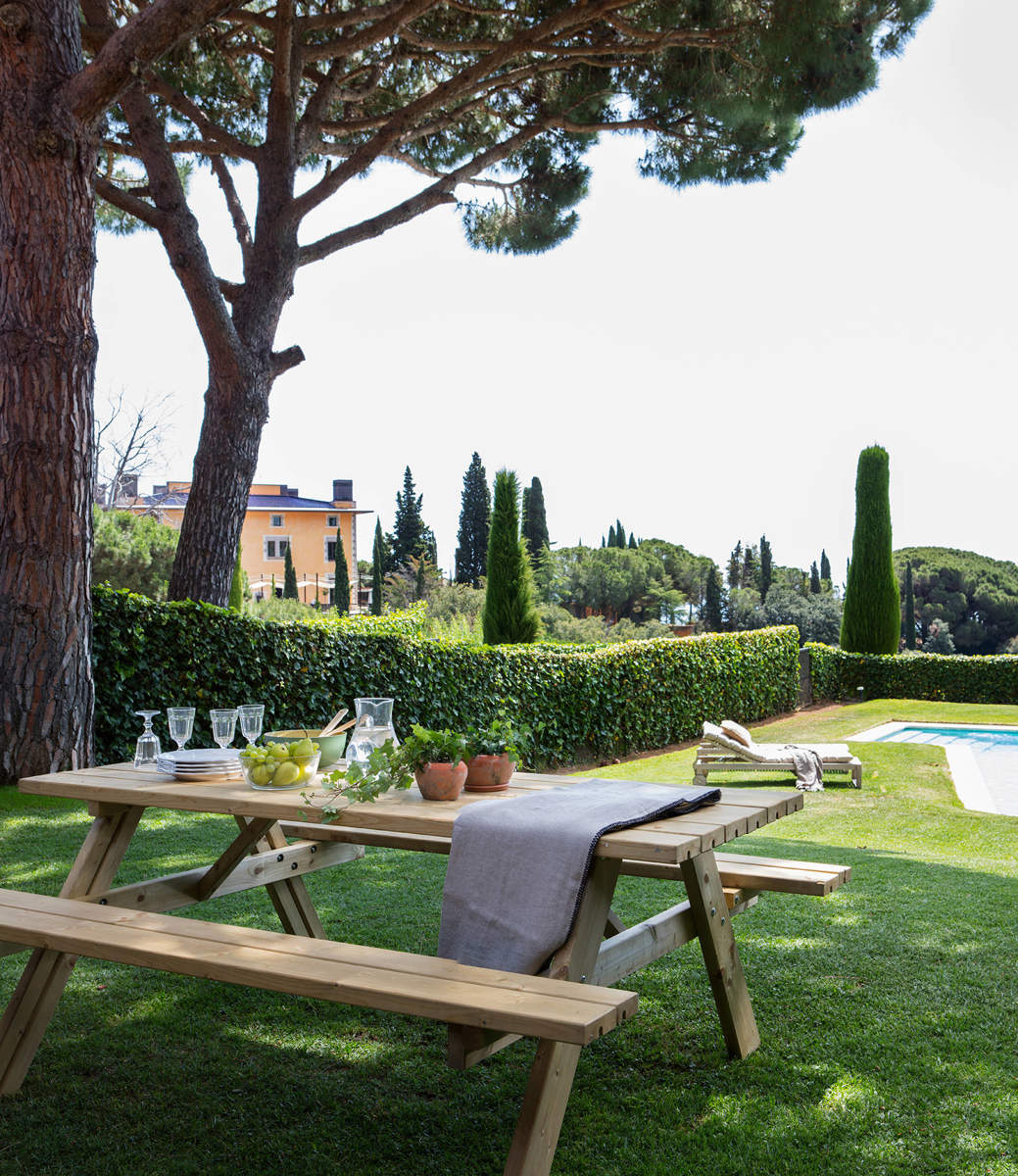 Une table en bois type pique-nique avec deux bancs suffit largement pour :