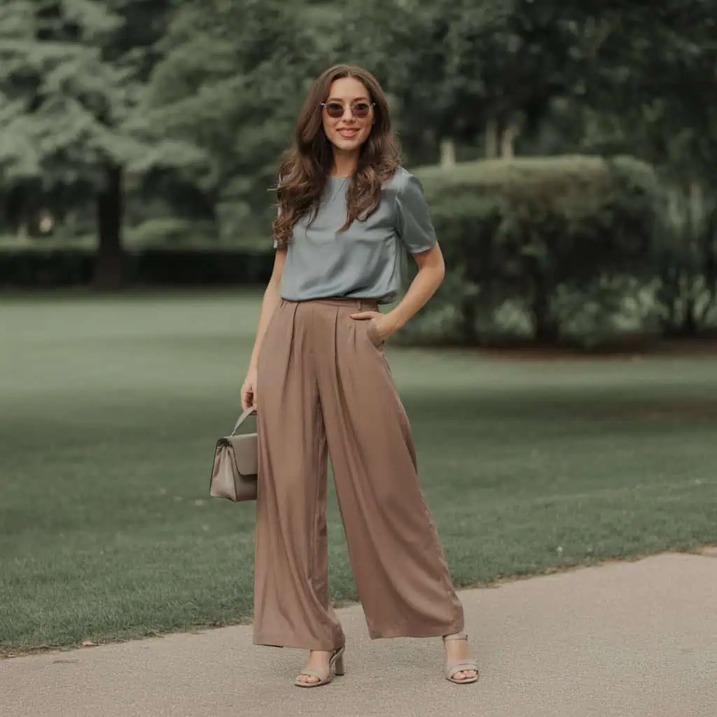 Un haut gris ardoise associé à un pantalon large chocolat crée une silhouette fluide et élégante. Cette combinaison est parfaite pour celles qui privilégient le confort sans sacrifier le style.