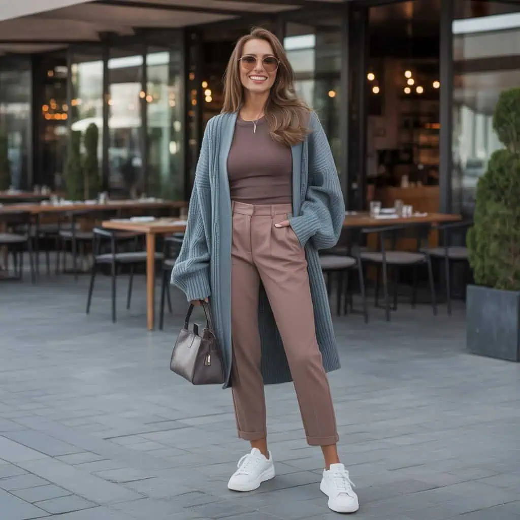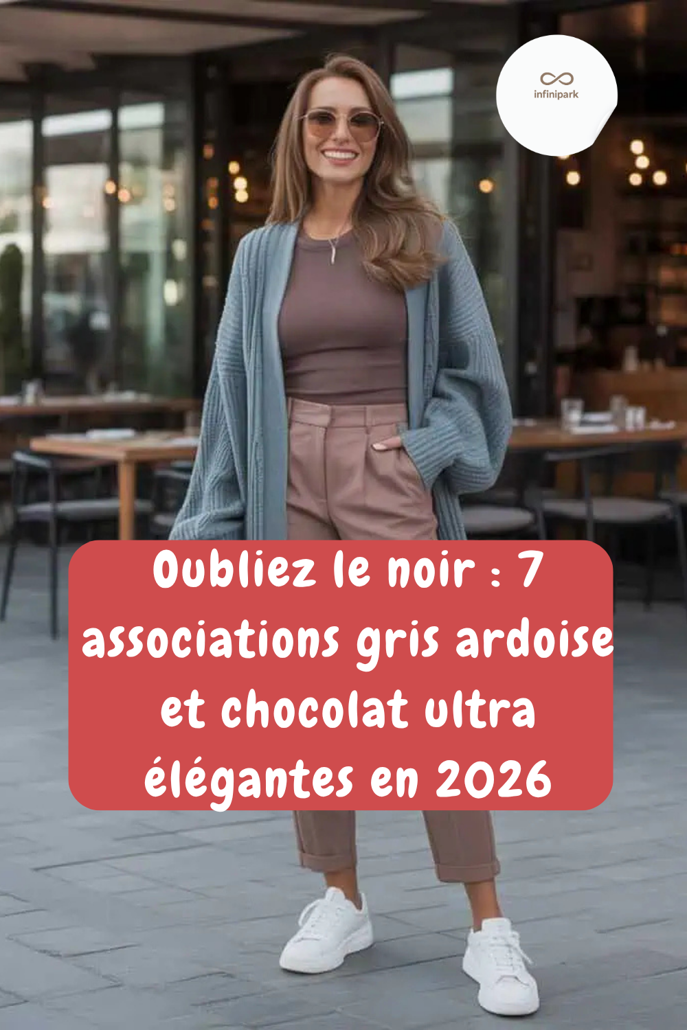 Mixer les tons gris ardoise et chocolat dans une même tenue permet de créer un look sophistiqué et moderne. Un cardigan gris ardoise oversize sur un top chocolat ajusté crée un joli jeu de volumes.